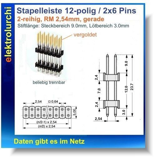 Sie bieten hier auf folgenden Artikel 3 Stück Stapelleiste Stiftleiste 12-polig 2-reihig, 2x6 Pin gerade, l=23,7mm, RM2.54 AU Kontaktmaterial vergoldet Polzahl: 12-polig Beliebig trennbar Ausführung: 2-reihig, gerade Stiftlänge gesamt: 23.70mm Stiftlänge Steckbereich: 9.0mm Stiftlänge Lötbereich: 3,