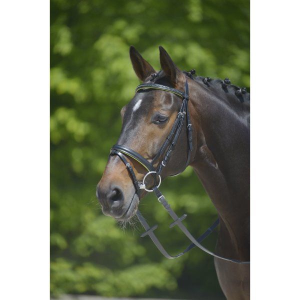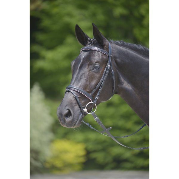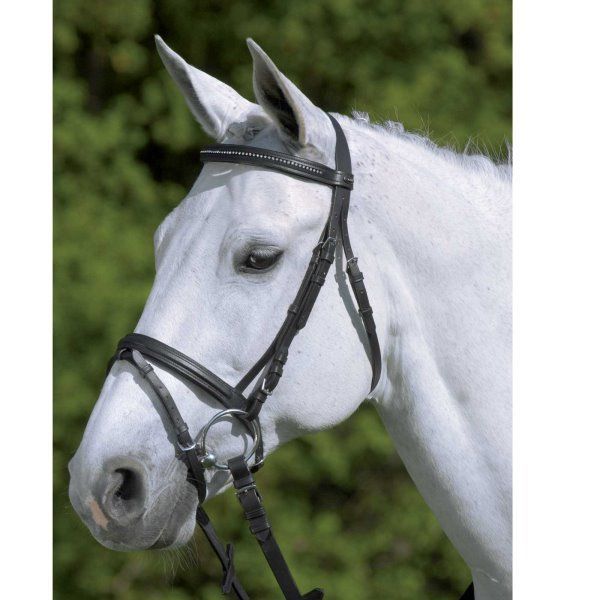 STAR Trensenzaum DIAMOND WA 81357 Englisch kombiniertes Reithalfter Gerades Genickstück Gerades Stirnband mit farbiger Strasssteinkette Nasenriemen und Stirnband weich unterlegt Vernickelte Eisenbeschläge Farbe braun mit messingfarbenen Beschlägen 19 mm Gurtzügel, 16 mm bei MSH & SH STAR Die gut