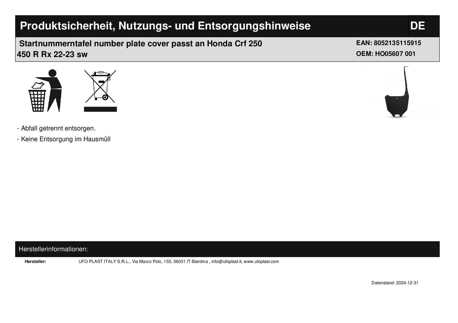 Startnummerntafel number plate cover passt an Honda Crf 250 450 R Rx 22-23 sw