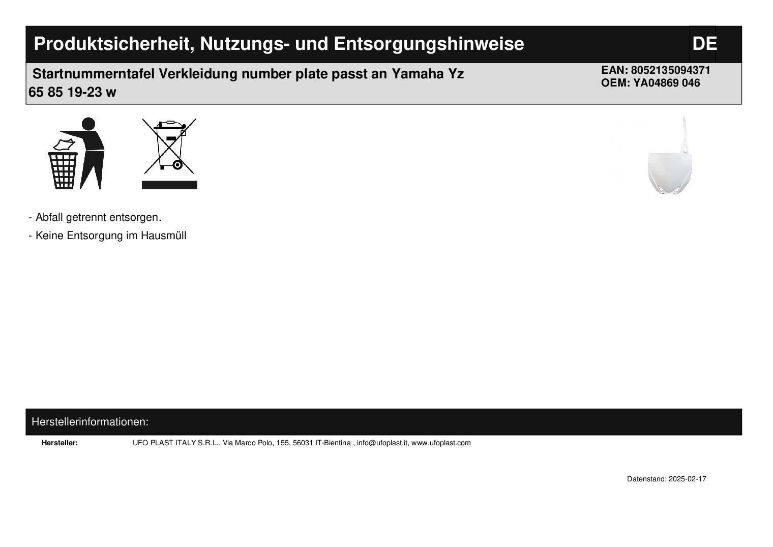 Startnummerntafel Verkleidung number plate passt an Yamaha Yz 65 85 19-23 w