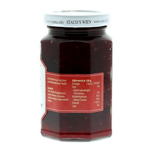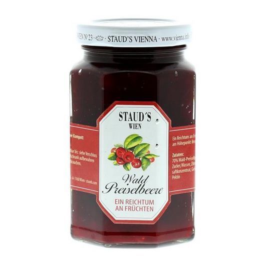 Staud's Wien - Wald Preiselbeere Konfitüre 70% Fruchtanteil 250g - 3 Varianten Staud's Wald Preiselbeerkonfitüre enthält natürliche Waldpreiselbeeren. Diese wurden ausgereift geerntet und erfreuen mit ihrem intensiven Frucht-Aroma. mit natürlichen Waldpreiselbeeren intensiv-fruchtiger Geschmack Stau