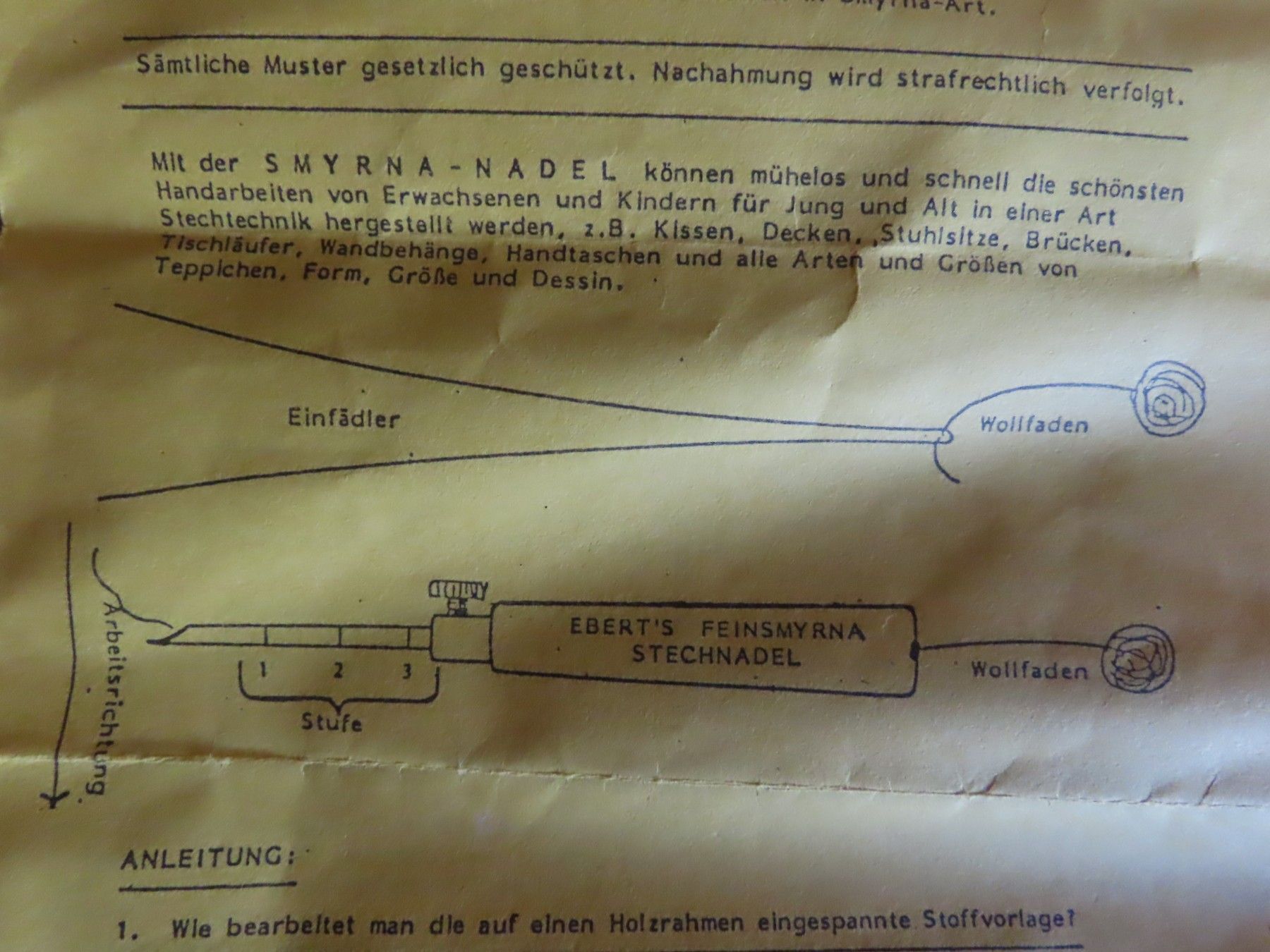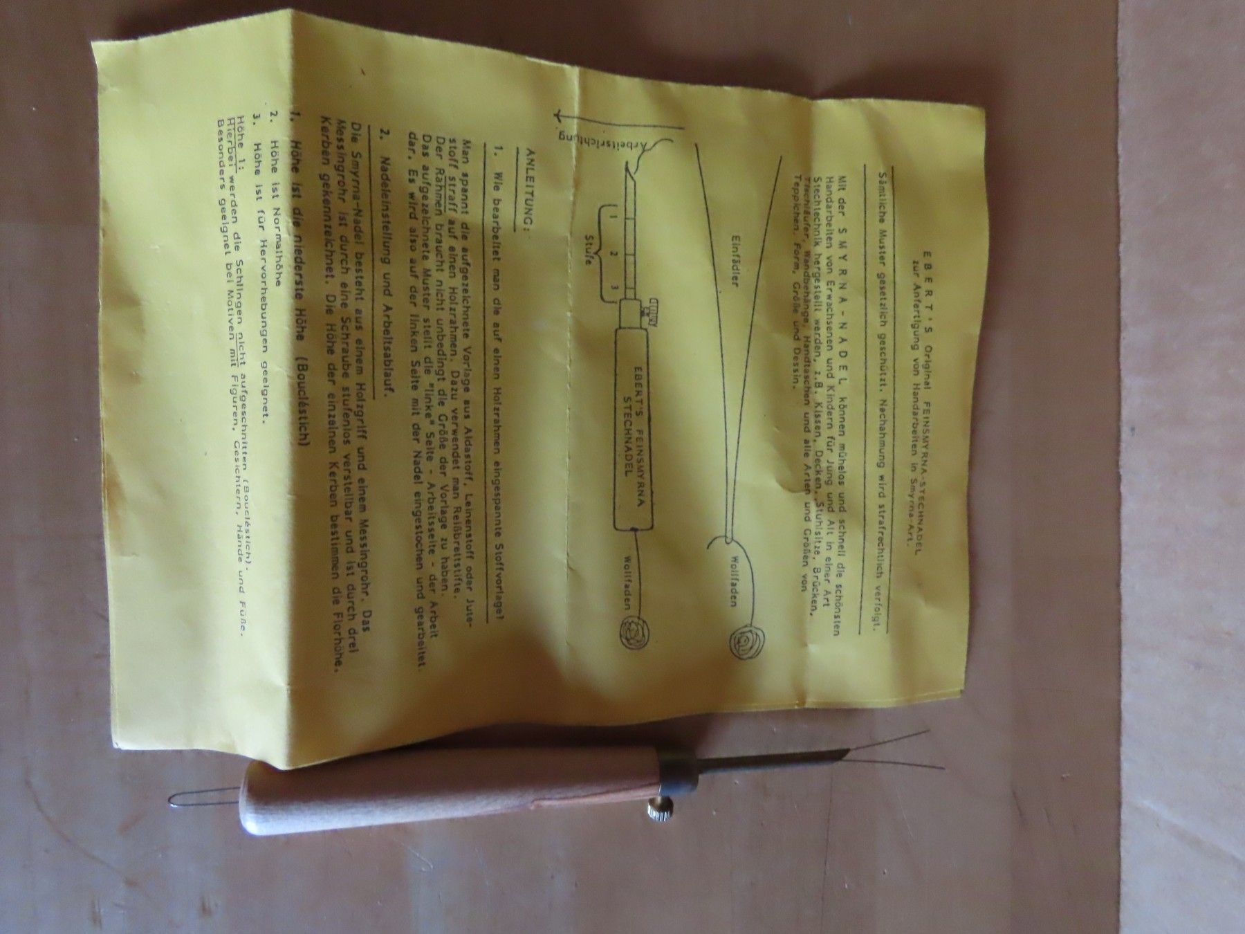 EBERT'S Original FEINSMYRNA-STECHNADEL zur Anfertigung von Handarbeiten in Smyrna-Art. Sämtliche Muster gesetzlich geschützt. Nachahmung wird strafrechtlich verfolgt. Mit der SMYRNA-NADEL können mühelos und schnell die schönsten Handarbeiten von Erwachsenen und Kindern für Jung und Alt in einer Art ... Mehr