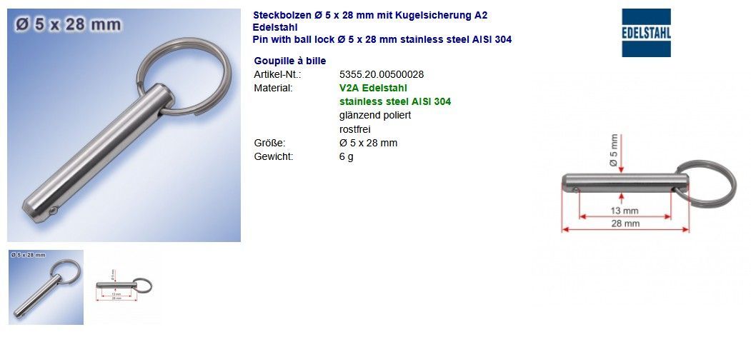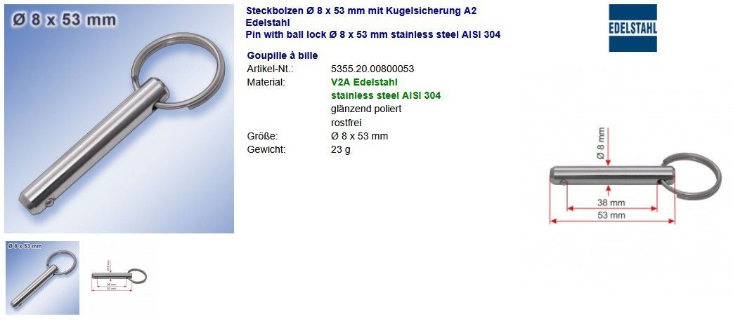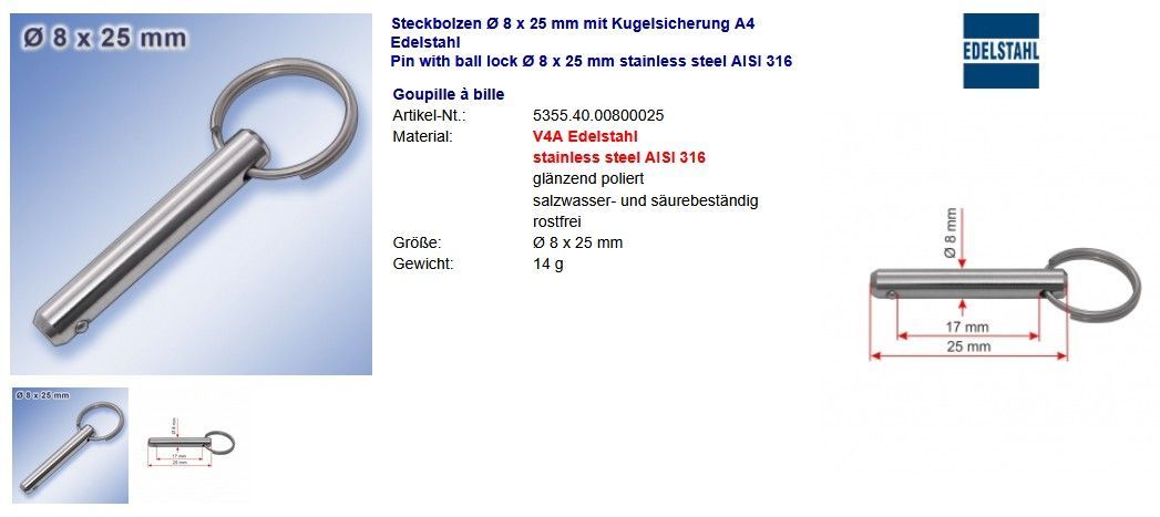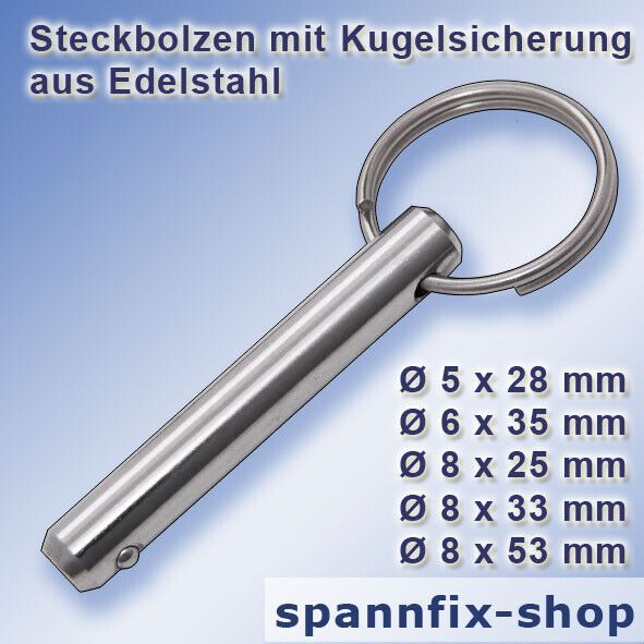 Steckbolzen mit Kugelsicherung Edelstahl Niro Stainless Yacht Steel Bootsport