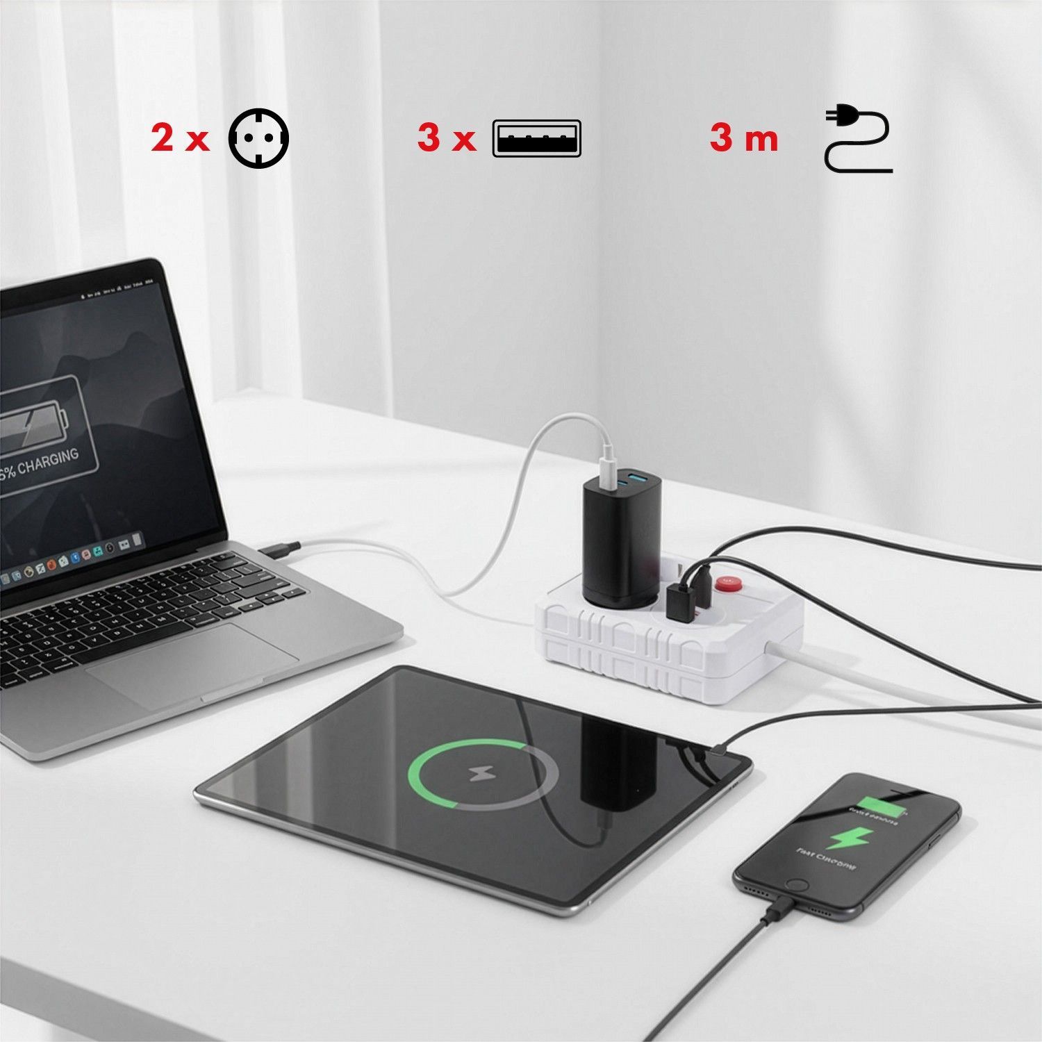 Steckdosenleiste 2 Steckdosen 2500W 3xUSB weiß 3m MCE388 W Maclean