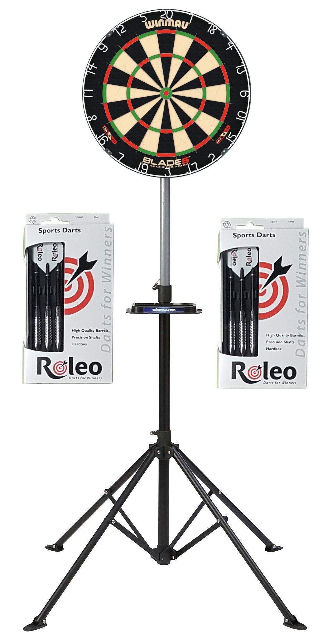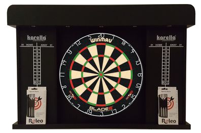 • Steeldart Set Dartscheibe Winmau Blade 6 + Kabinett + 2 Satz Roleo Dartpfeile