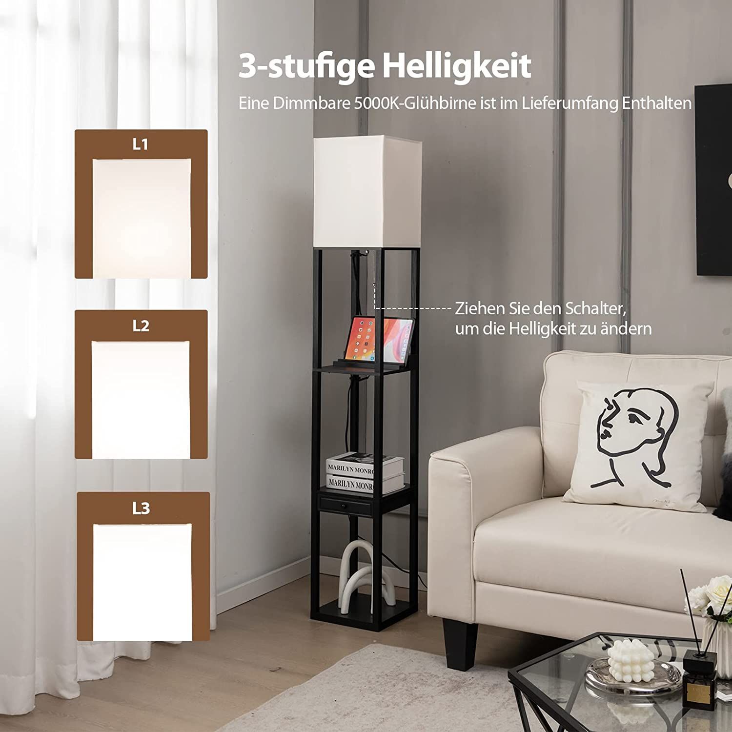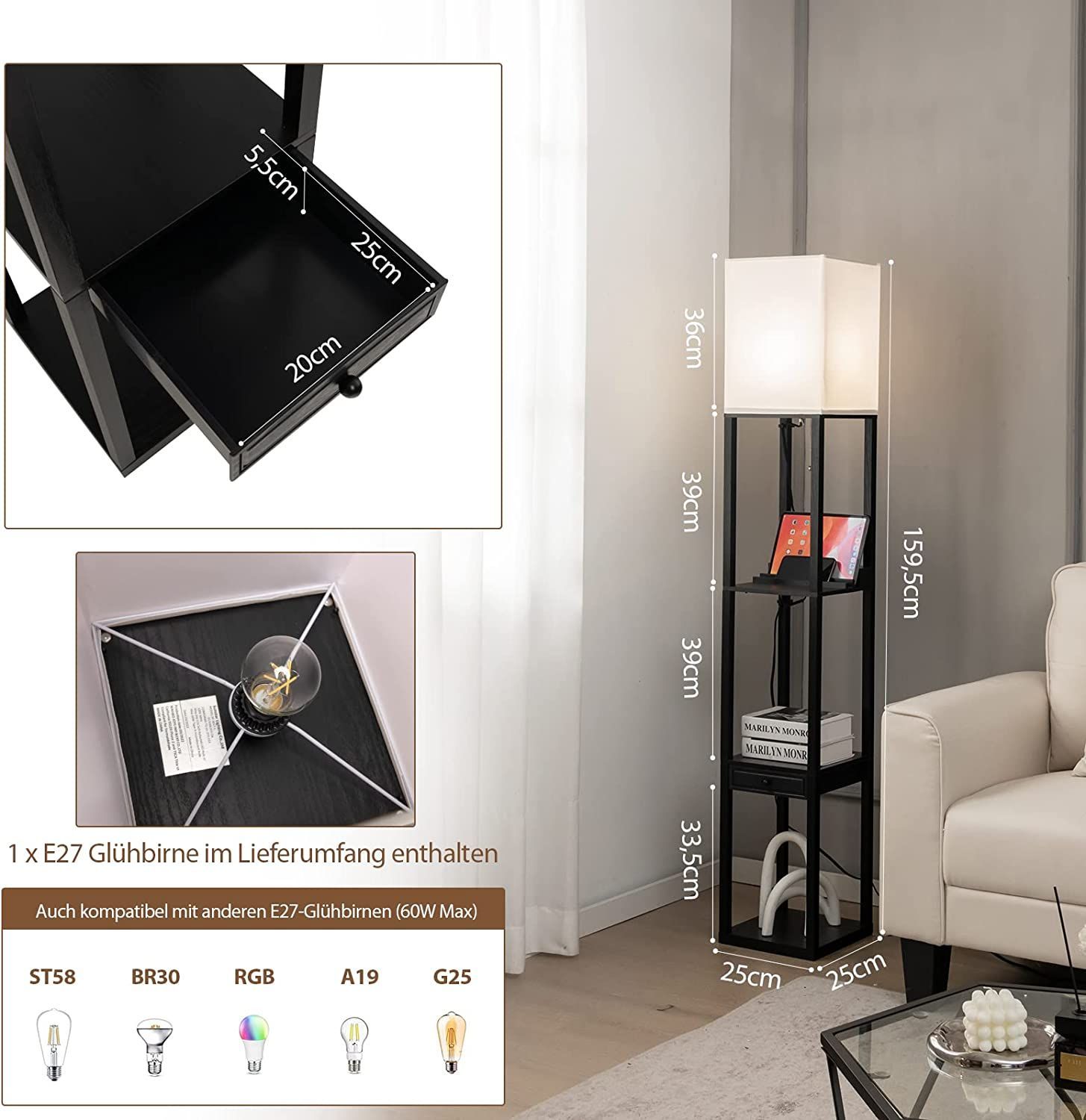 Stehleuchte Regal 160cm, Standleuchte Holz, E27 Regal-Stehlampe