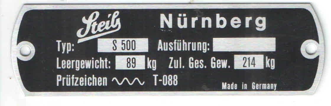 Steib Seitenwagen Typenschild Typ S 500, Alu, Blanko, Neu, Oldtimer
