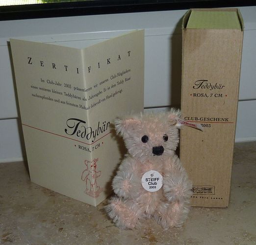 Auflösung meiner Steiff-Sammlung Steiff Club Teddy rosa mit Karton, Zertifikat, Knopf, Fahne und Brustschild 10 cm Mohair Herstellung 2003