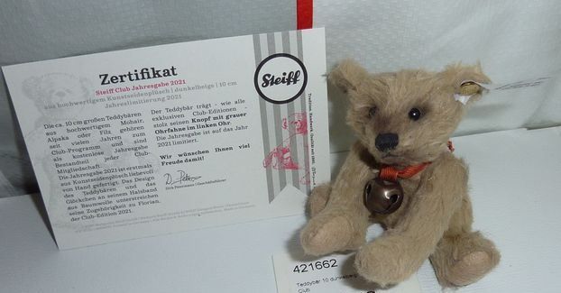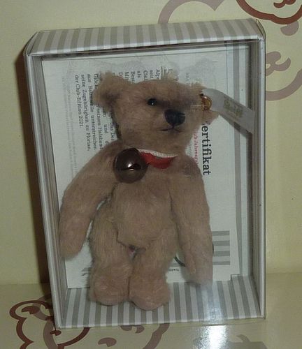 Auflösung meiner Steiff-Sammlung Club Teddybär dunkelbeige mit Karton, Zertifikat, Knopf und Fahne, ein Brustschild hatte er nicht 11 cm gegliedert aus Seidenplüsch Herstellung 2021