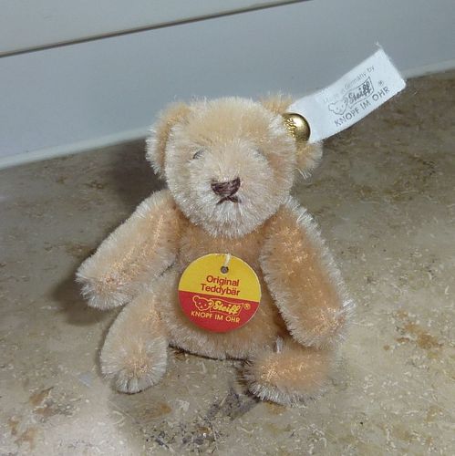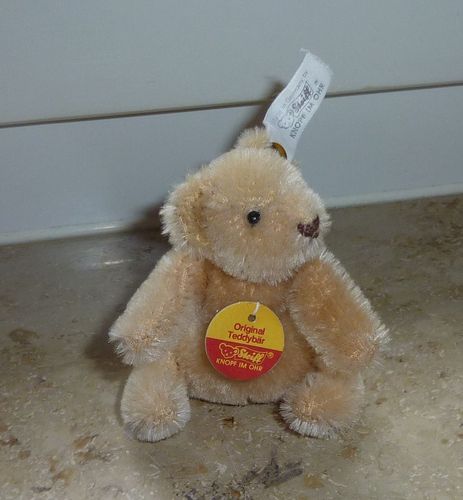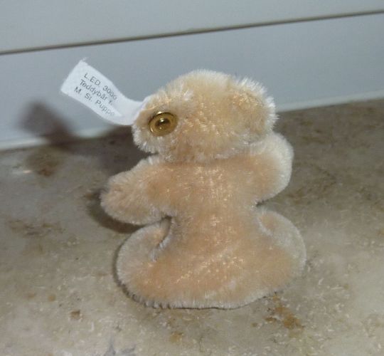 Auflösung meiner Steiff-Sammlung Original Teddybär für eine Steiff Puppe mit vergoldetem Knopf, Fahnennummer ist nicht vorhanden und Brustschild auf der Fahne kann man hinten noch lesen: L.E.D. 3000, Teddybär f. M.St. Puppe 7 cm hoch der Kopf ist drehbar aus blondem Mohair der Teddy ist bespielt abe
