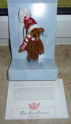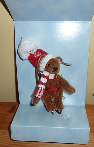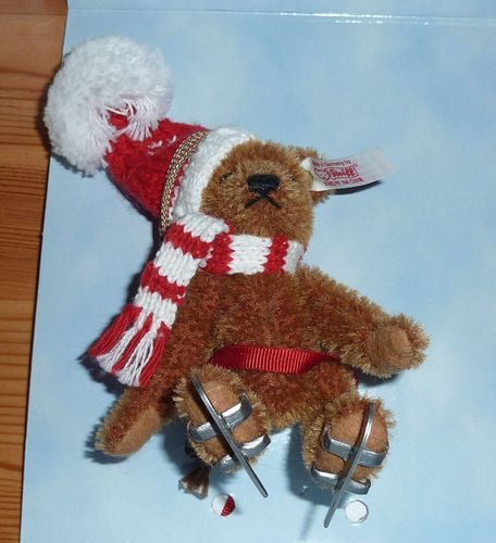 Auflösung meiner Steiff-Sammlung Teddybär Skater Schlittschuhläufer Ornament mit Karton, Zertifikat, Knopf, Fahne 667466 10 cm aus Mohair Herstellung 2005