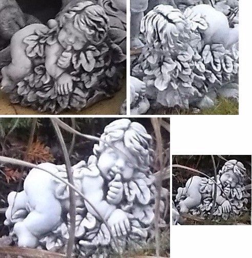 Steinfigur Engel Baby schlafende-liegende auf Blätter 13 kg Handarbeit Frostfest. NEU