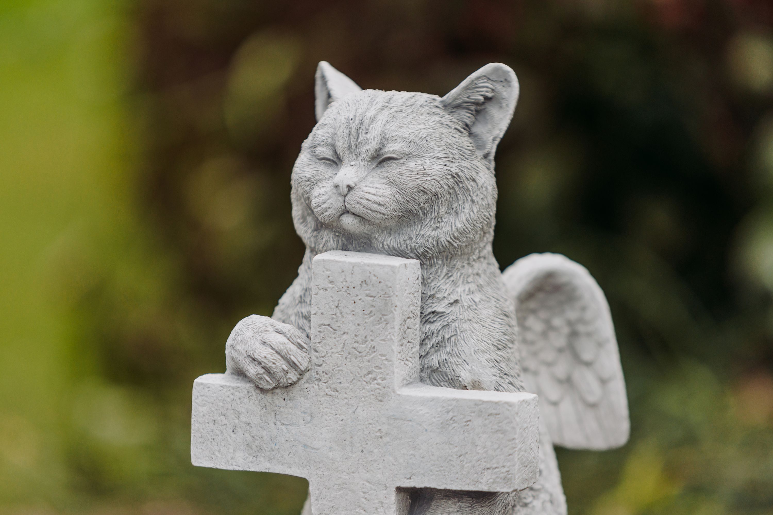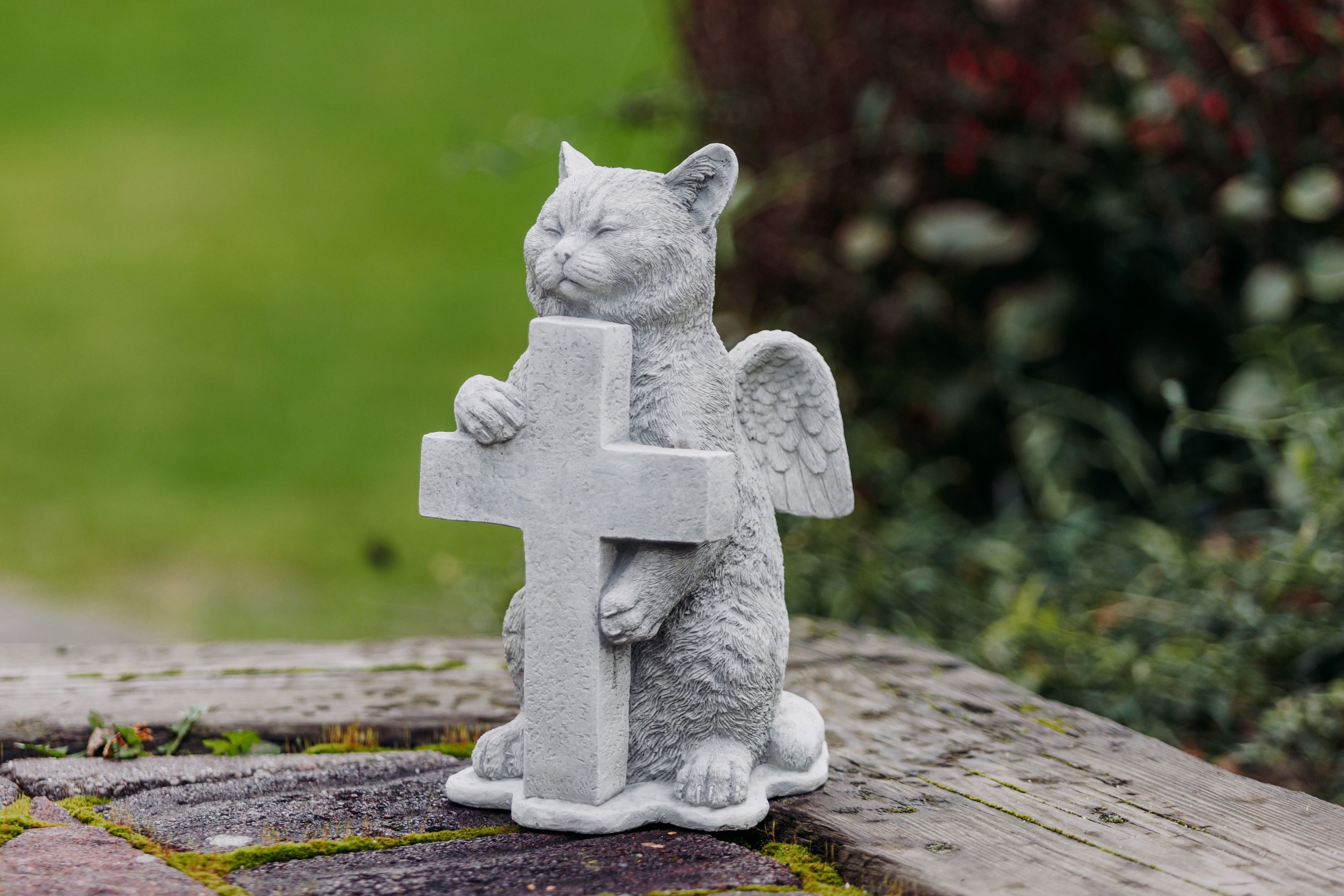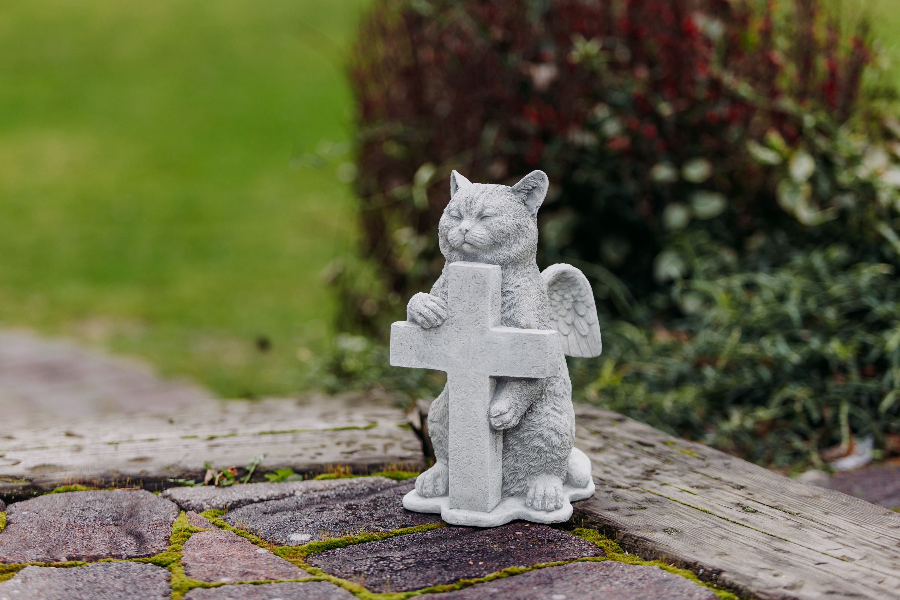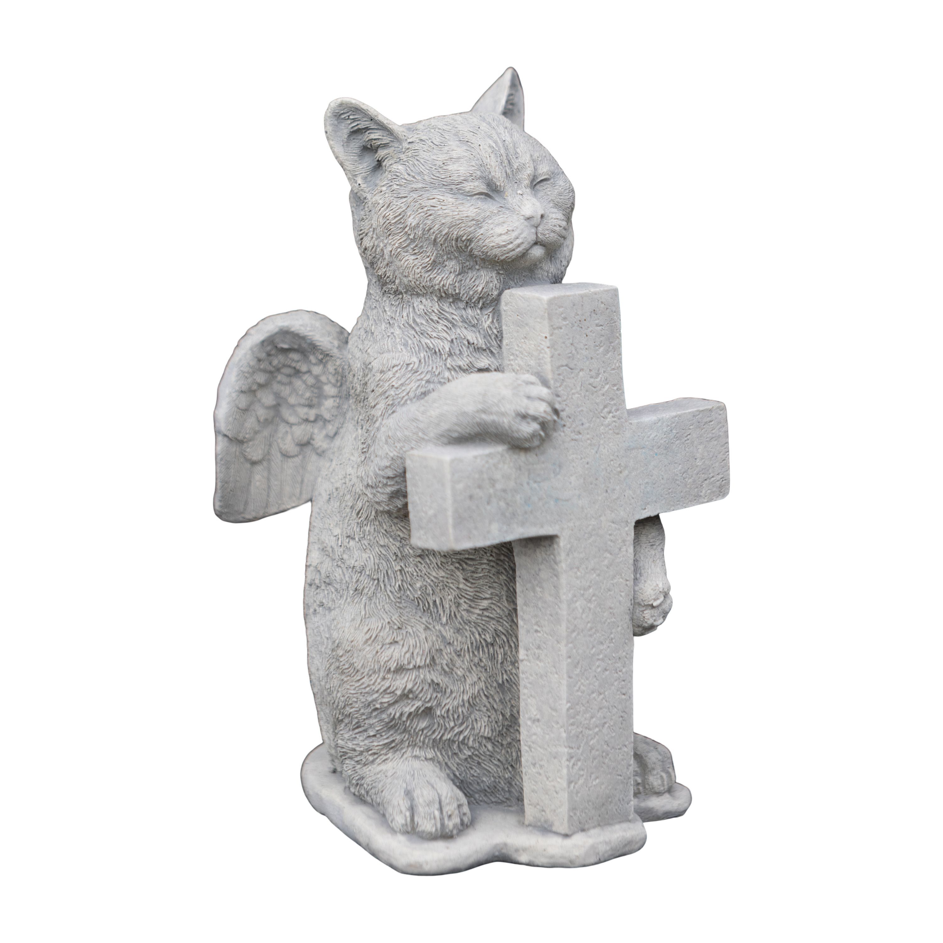 Steinfigur Engel - Katze mit Kreuz, H. 27 cm, 6 kg, aus Steinguss frostsicher