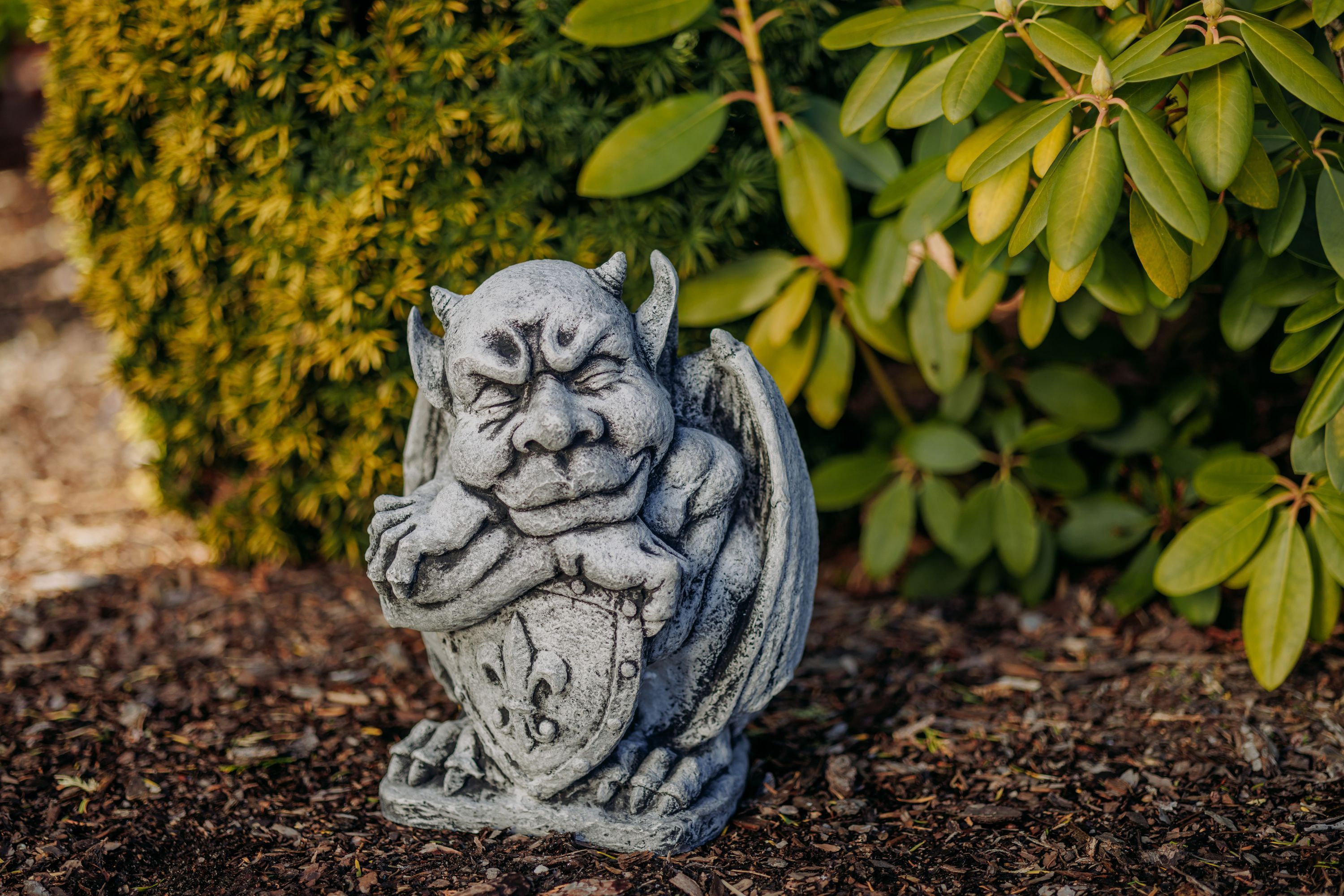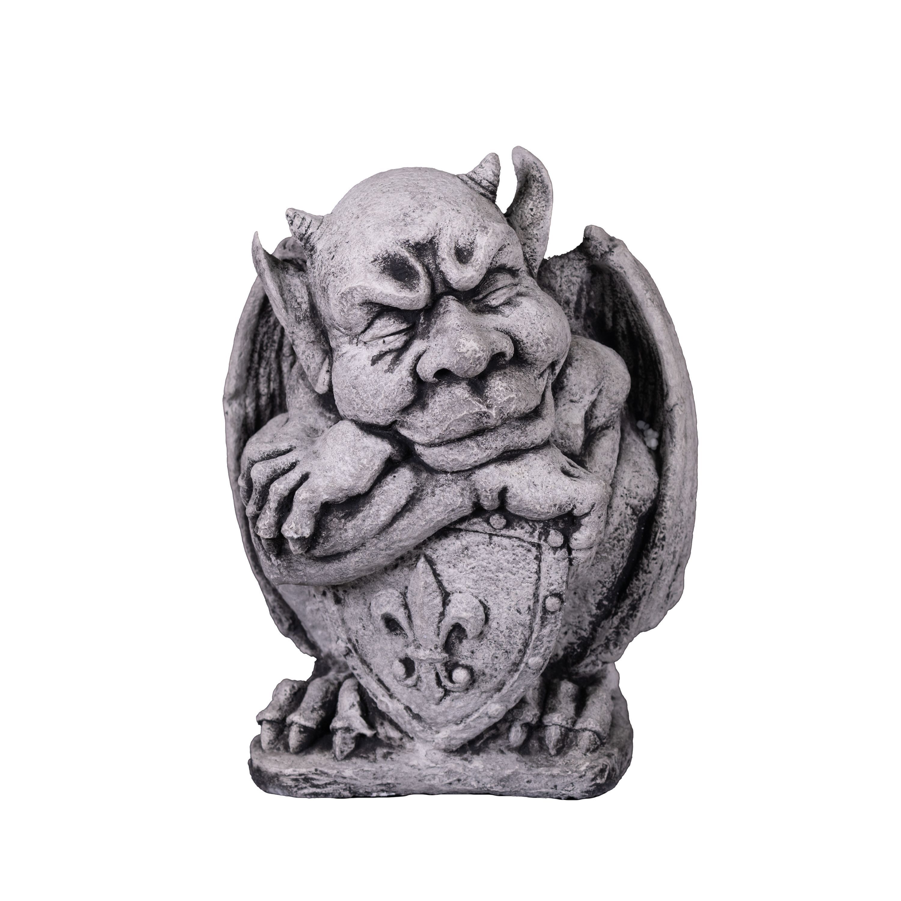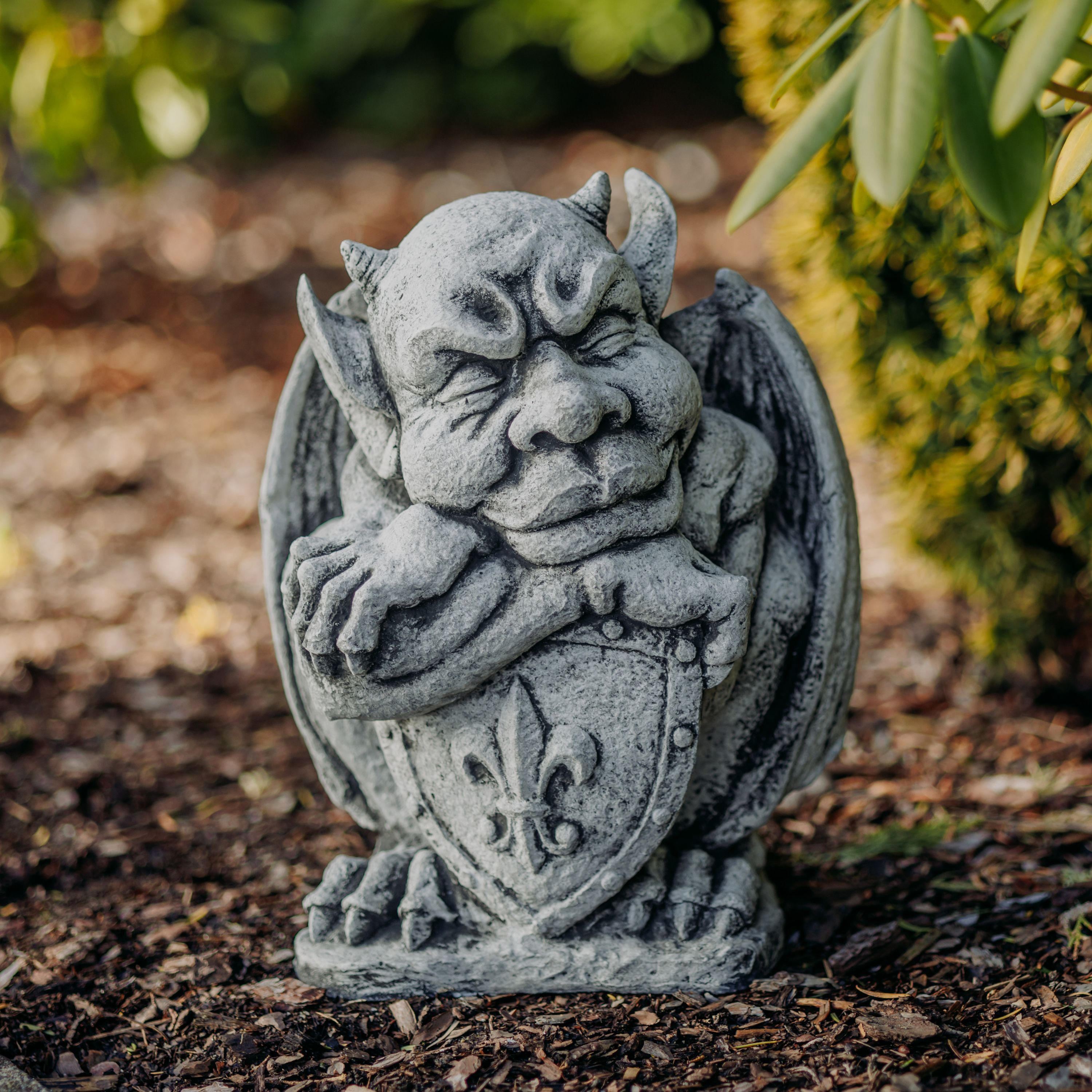 Steinfigur Gargoyle mit Schild, 33 cm Höhe, 17 kg, Grau, Gartenfigur aus Steinguss