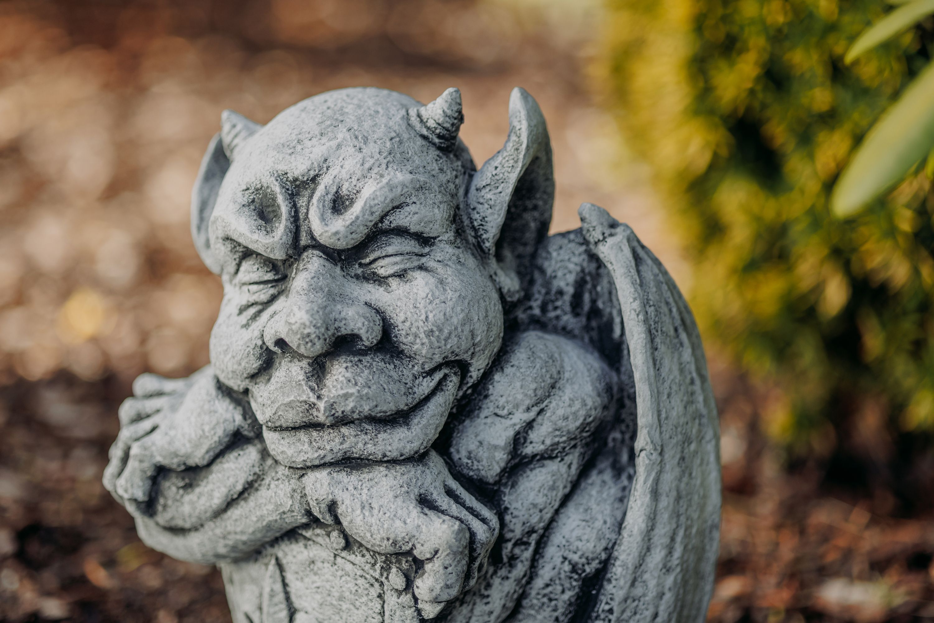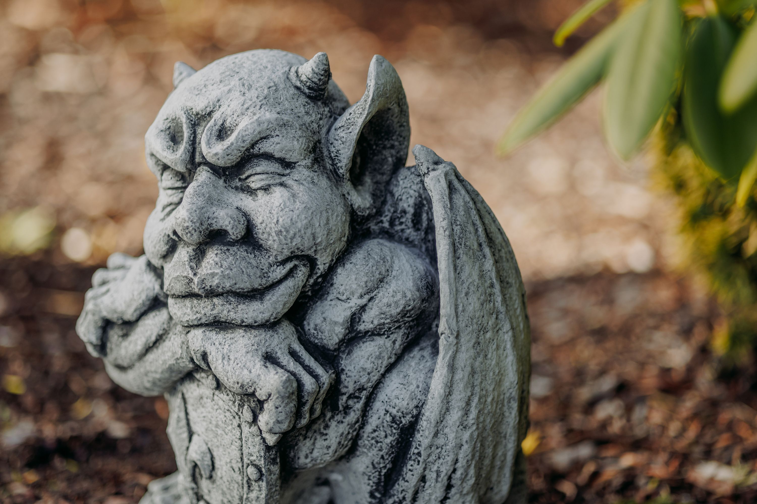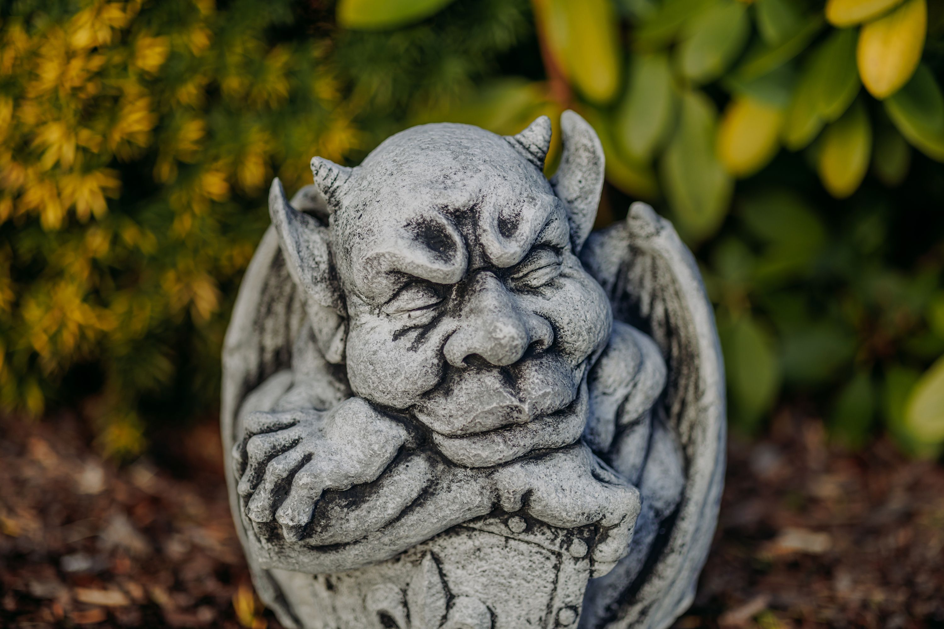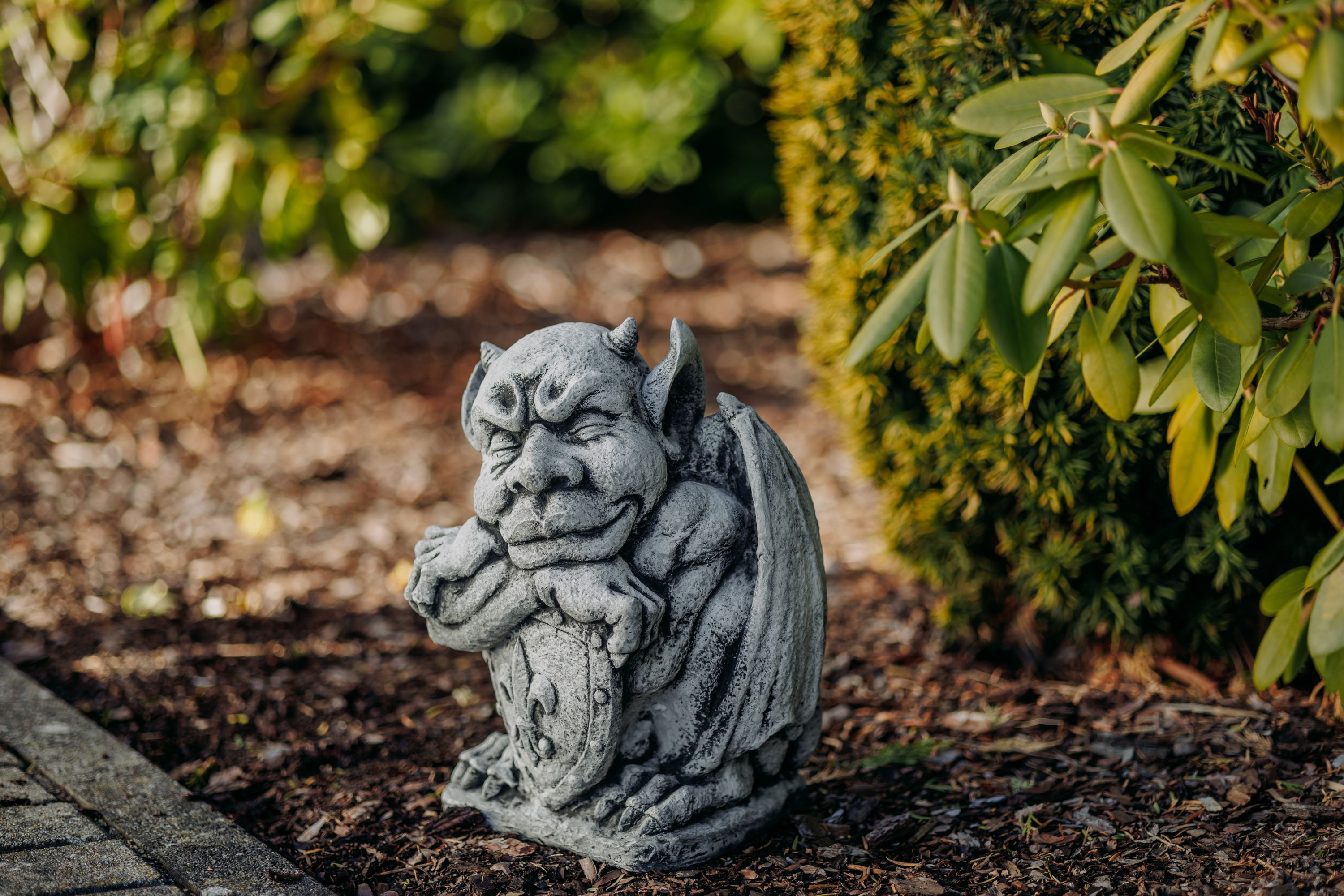 Steinfigur Gargoyle mit Schild, 33 cm Höhe, 17 kg, Grau, Gartenfigur aus Steinguss