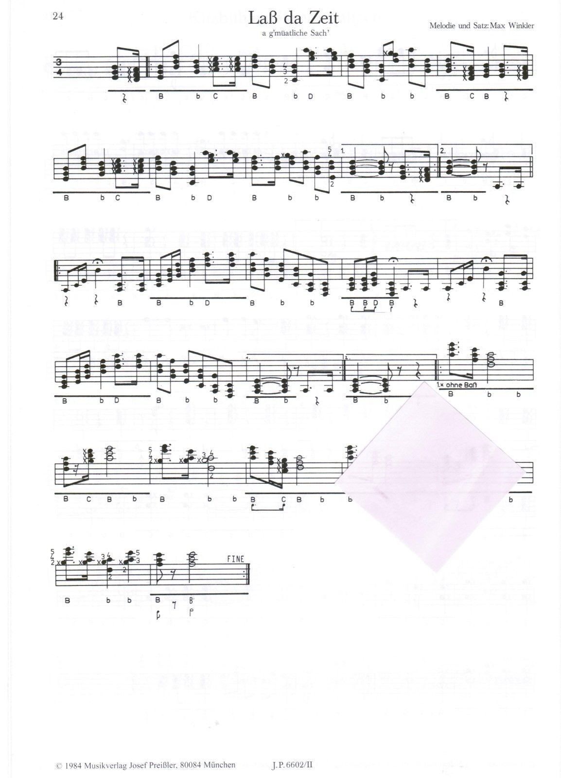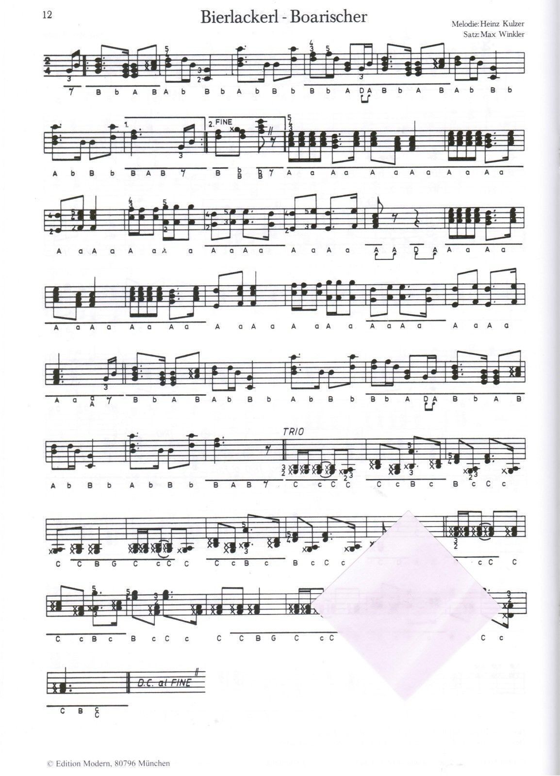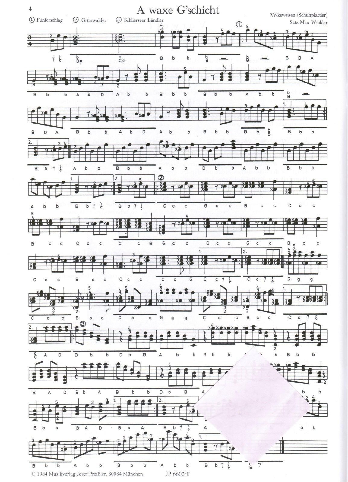 20 Stücke aus Bayern Band 2 für die Steirische Harmonika herausgegeben von Max Winkler Griffschrift mit Fingersatz für 3 Spielreihen Verlag : Preissler JP 6602 II Seitenanzahl: 24 Format: Din A 4 Zustand: NEUWARE Schwierigkeitsgrad : Mittelschwer (meine pers.Einschätzung) Inhalt: A waxe G'schicht An