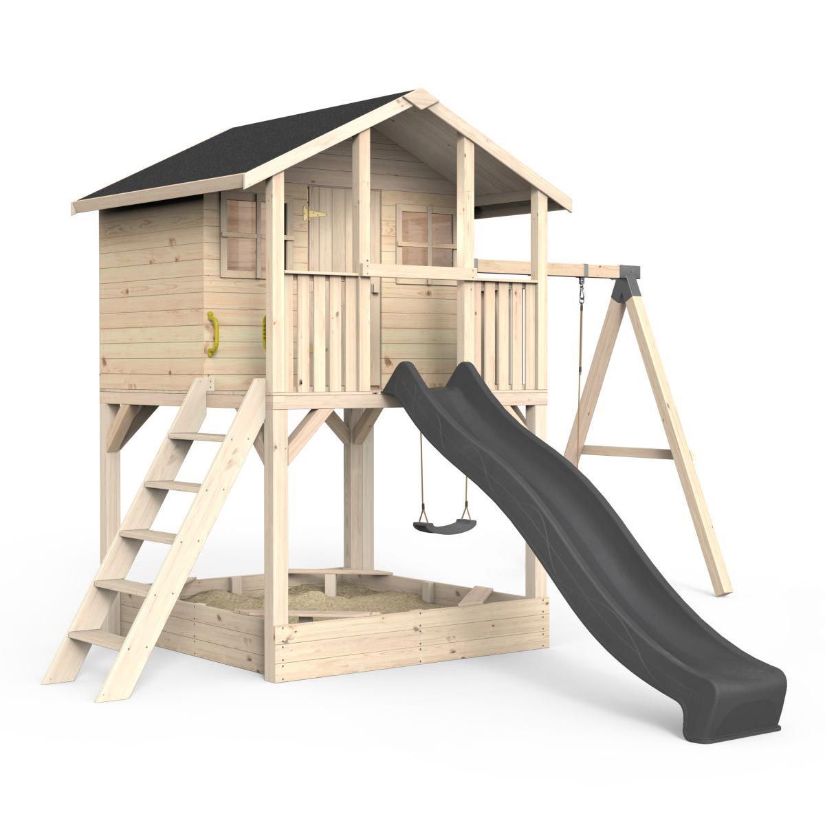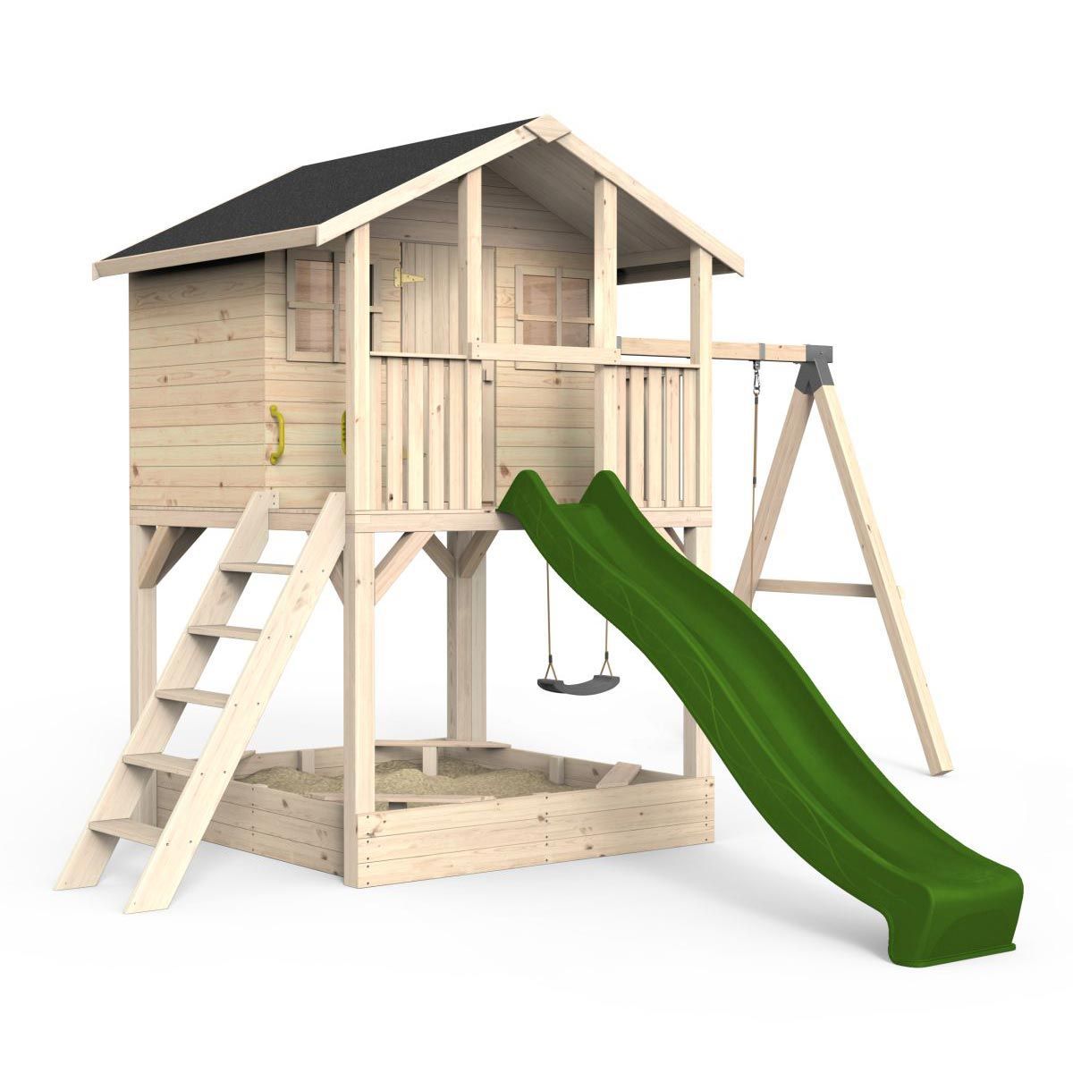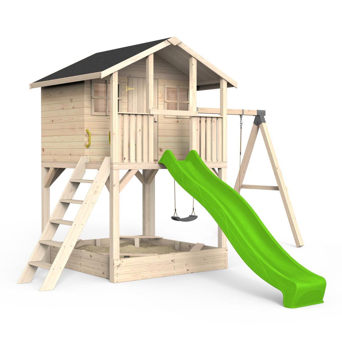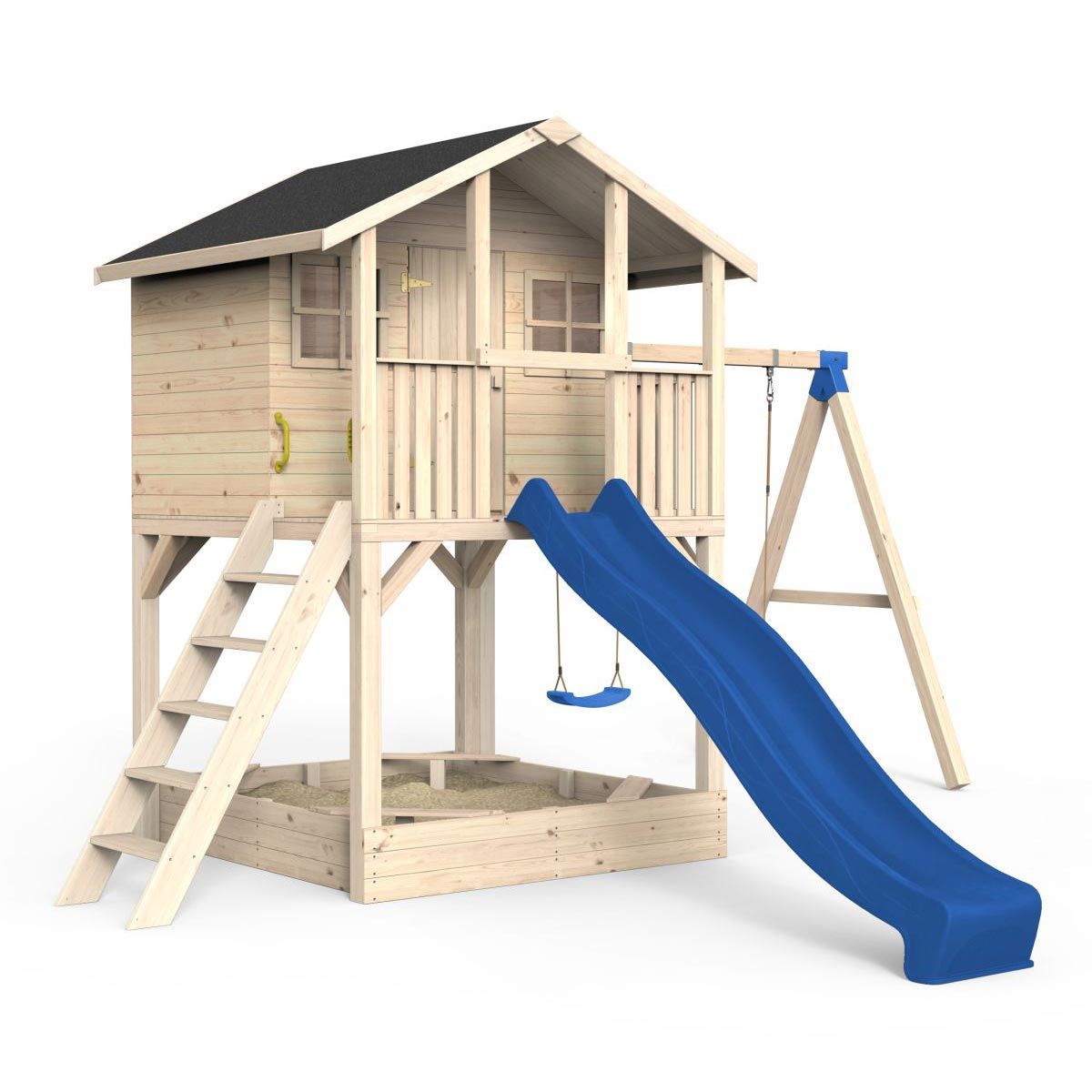 DOPPELT SCHWUNGVOLL! Ein Spielhaus mit Anbauschaukel vervielfacht die Spielmöglichkeiten für große und kleine Kinder. Sandkasten, Outdoor-Spielzimmer und Doppelschaukel. ? naturbelassenes Massivholz, nordische Fichte ? Wände 1,6 cm und Pfosten 9x9 cm ? sicherer Aufstieg auf Treppe, Veranda ? einfache Montage dank Elementbauweise ? abenteuerliche Podesthöhe, großartige Spielfläche ? Dachpappe inklusive ? Mit Rutsche und Bodenanker … weitere Vorteile siehe Produktbesc