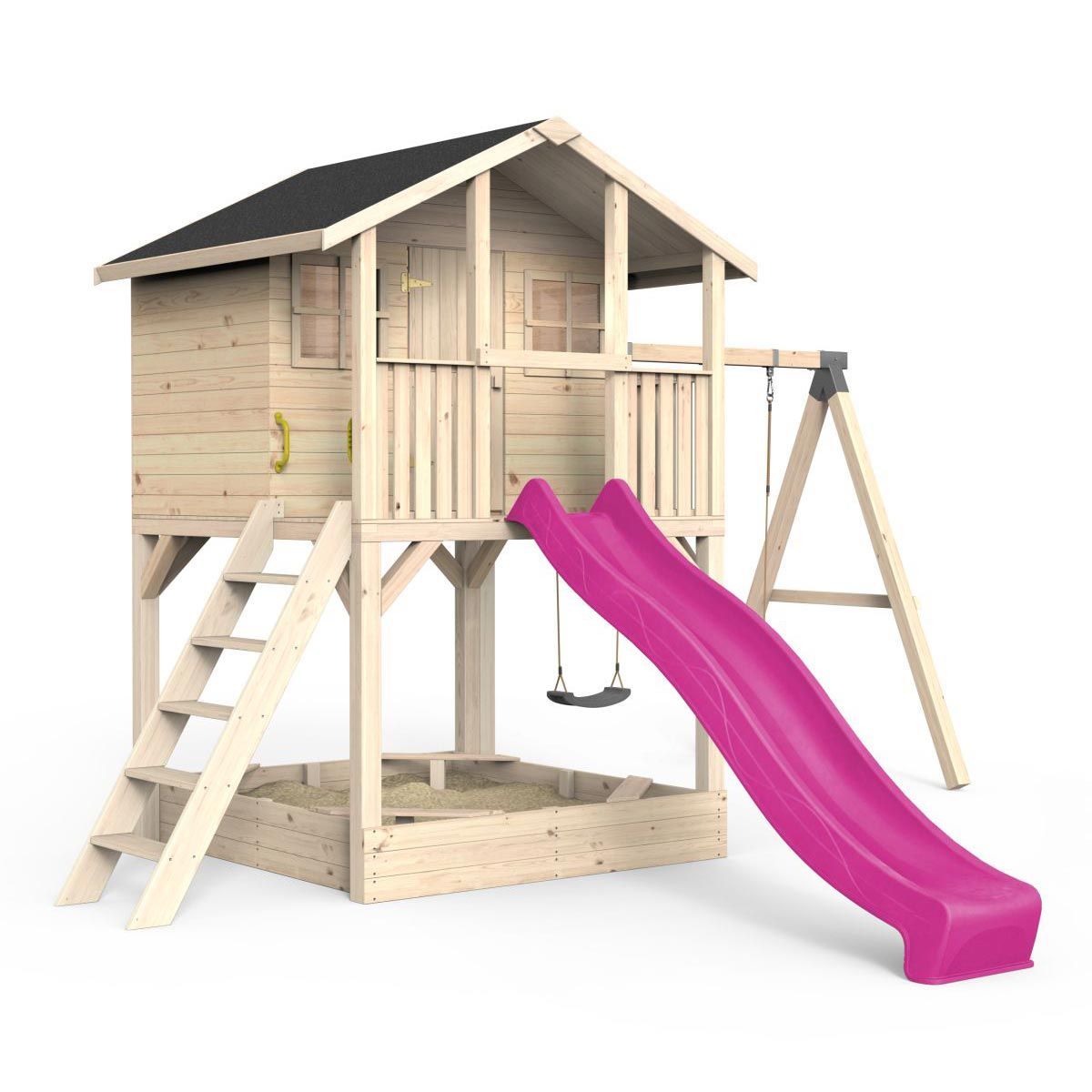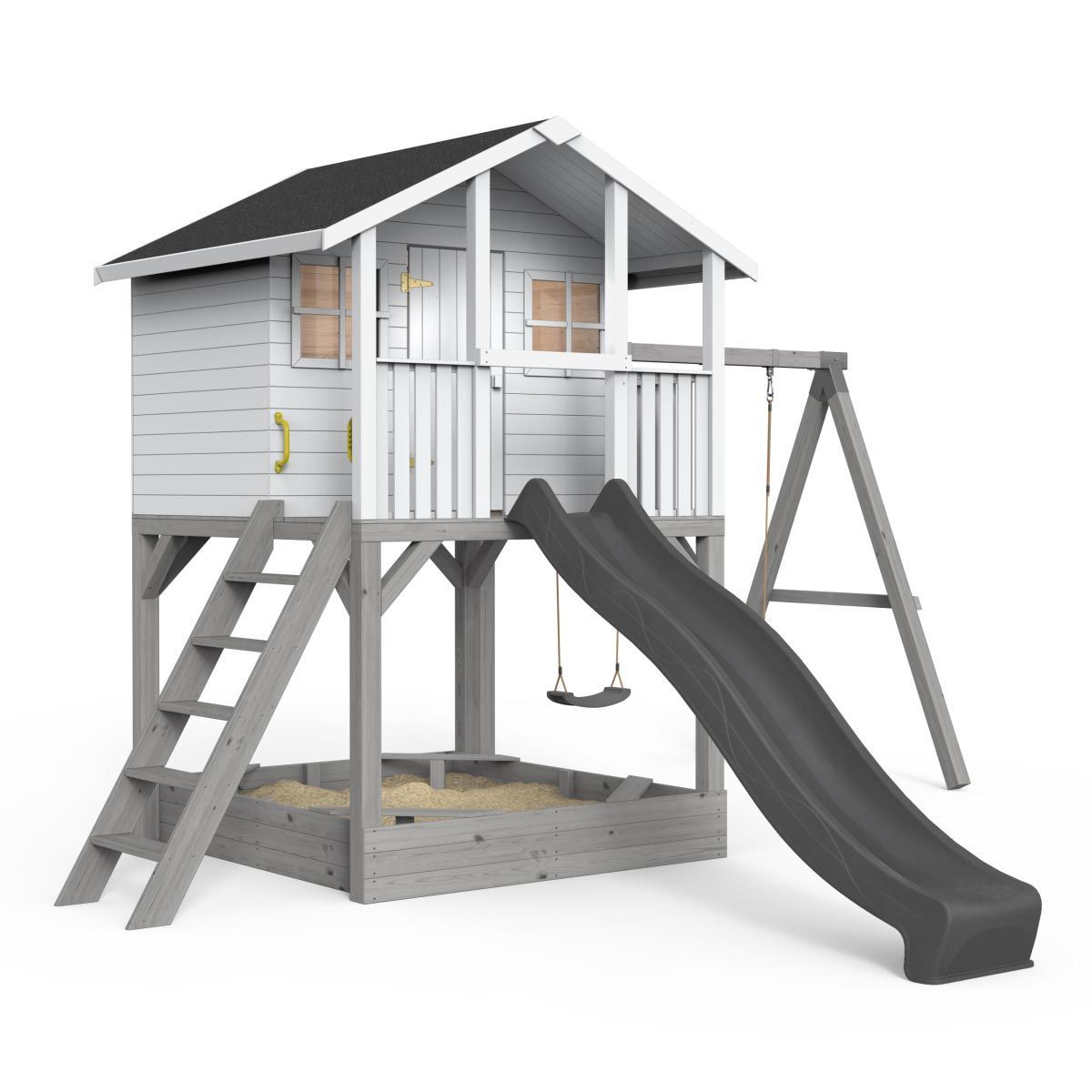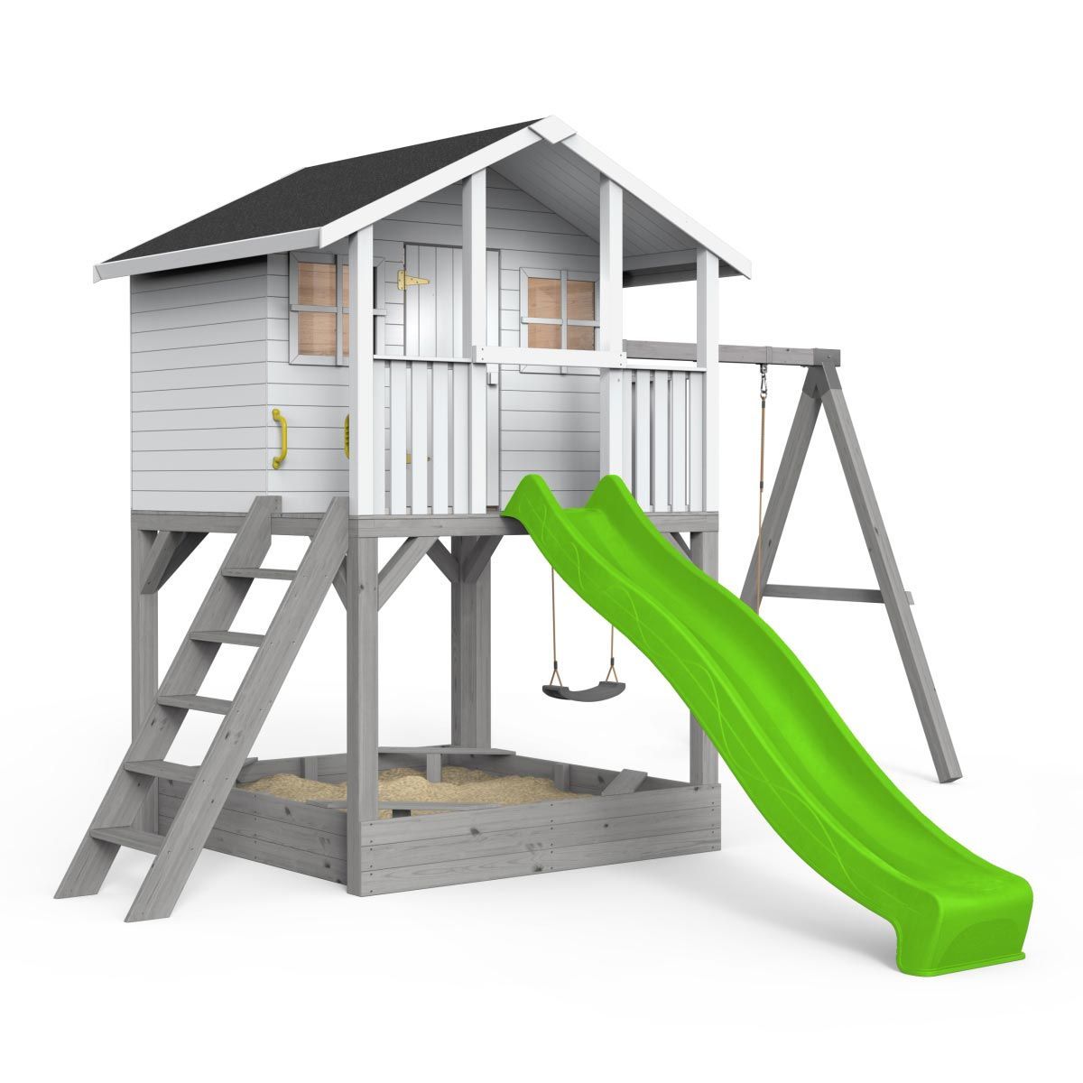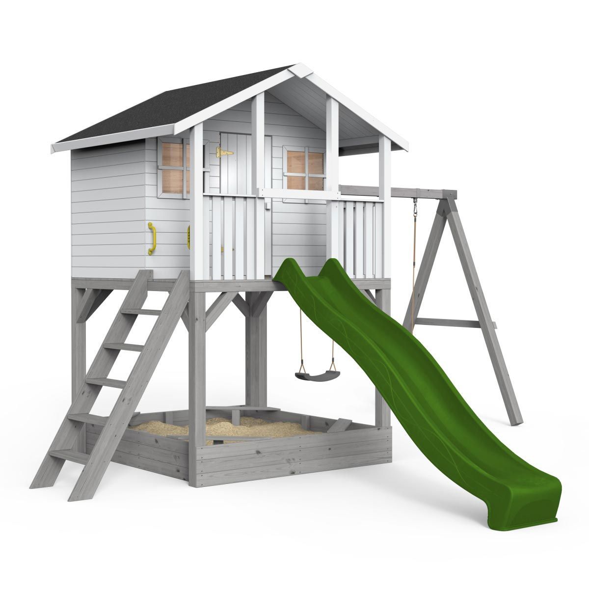 DOPPELT SCHWUNGVOLL! Ein Spielhaus mit Anbauschaukel vervielfacht die Spielmöglichkeiten für große und kleine Kinder. Sandkasten, Outdoor-Spielzimmer und Doppelschaukel. ? naturbelassenes Massivholz, nordische Fichte ? Wände 1,6 cm und Pfosten 9x9 cm ? sicherer Aufstieg auf Treppe, Veranda ? einfache Montage dank Elementbauweise ? abenteuerliche Podesthöhe, großartige Spielfläche ? Dachpappe inklusive ? Mit Rutsche und Bodenanker … weitere Vorteile siehe Produktbesc