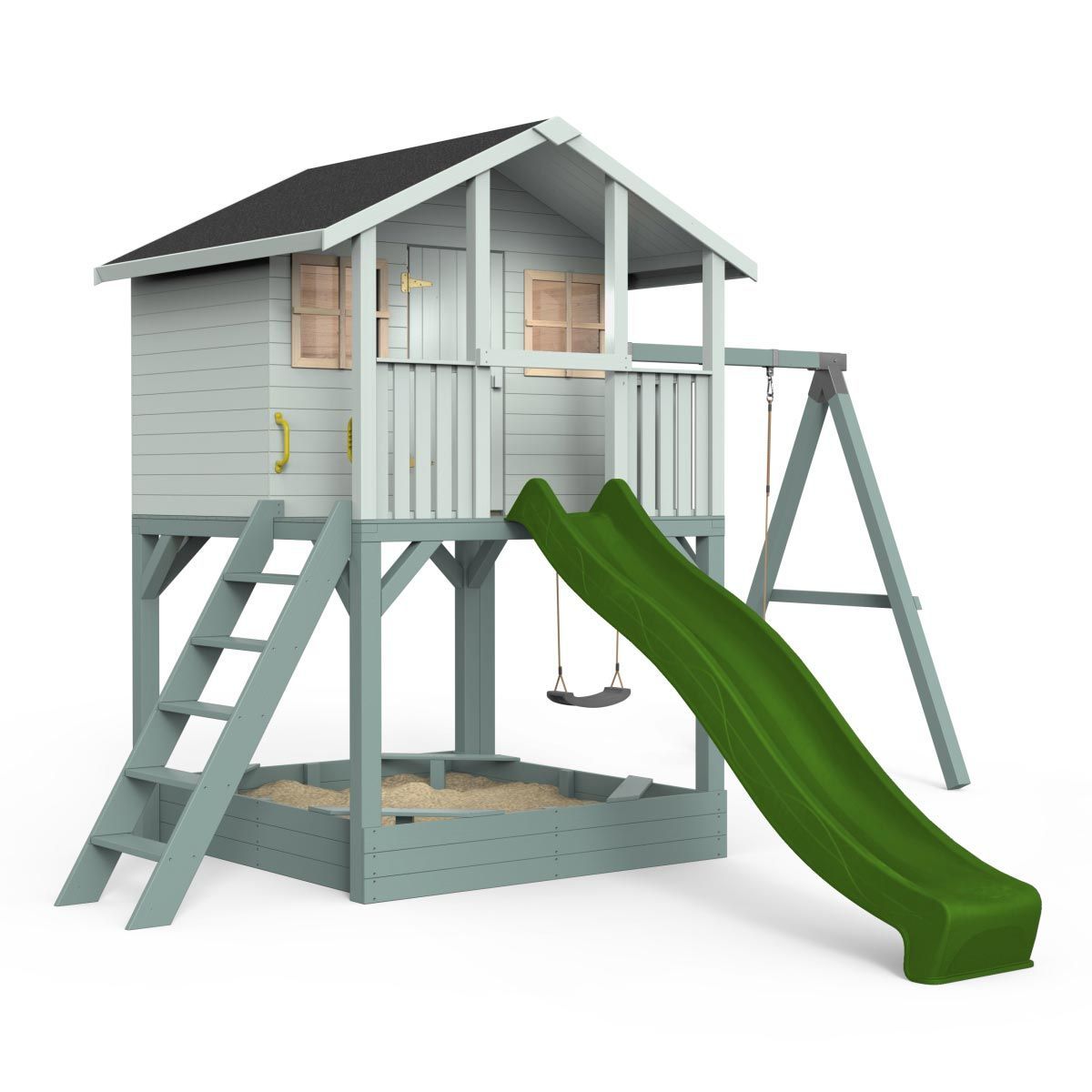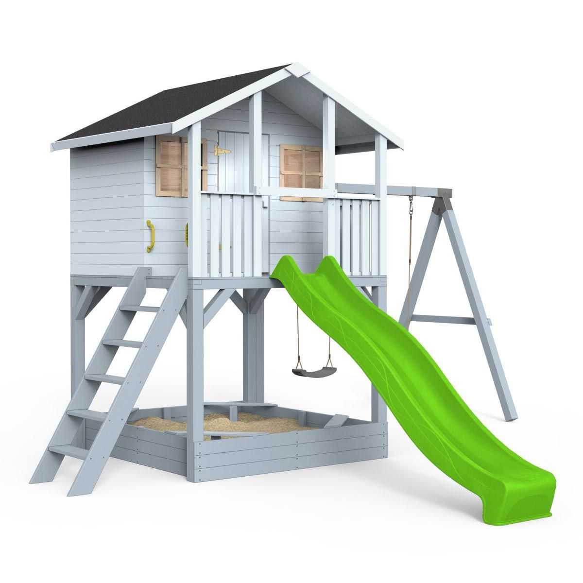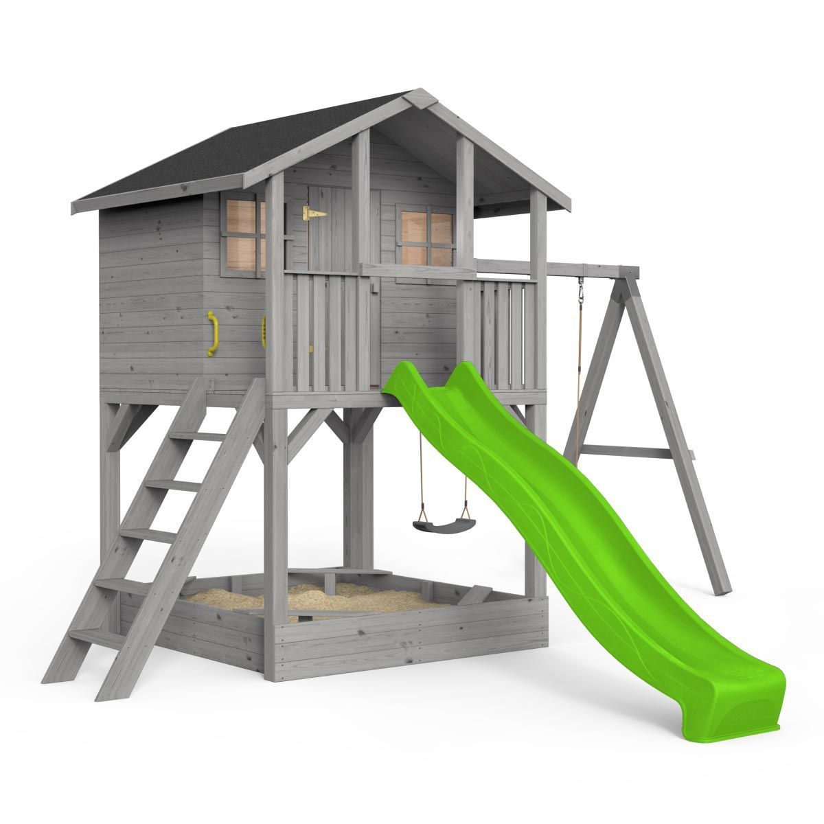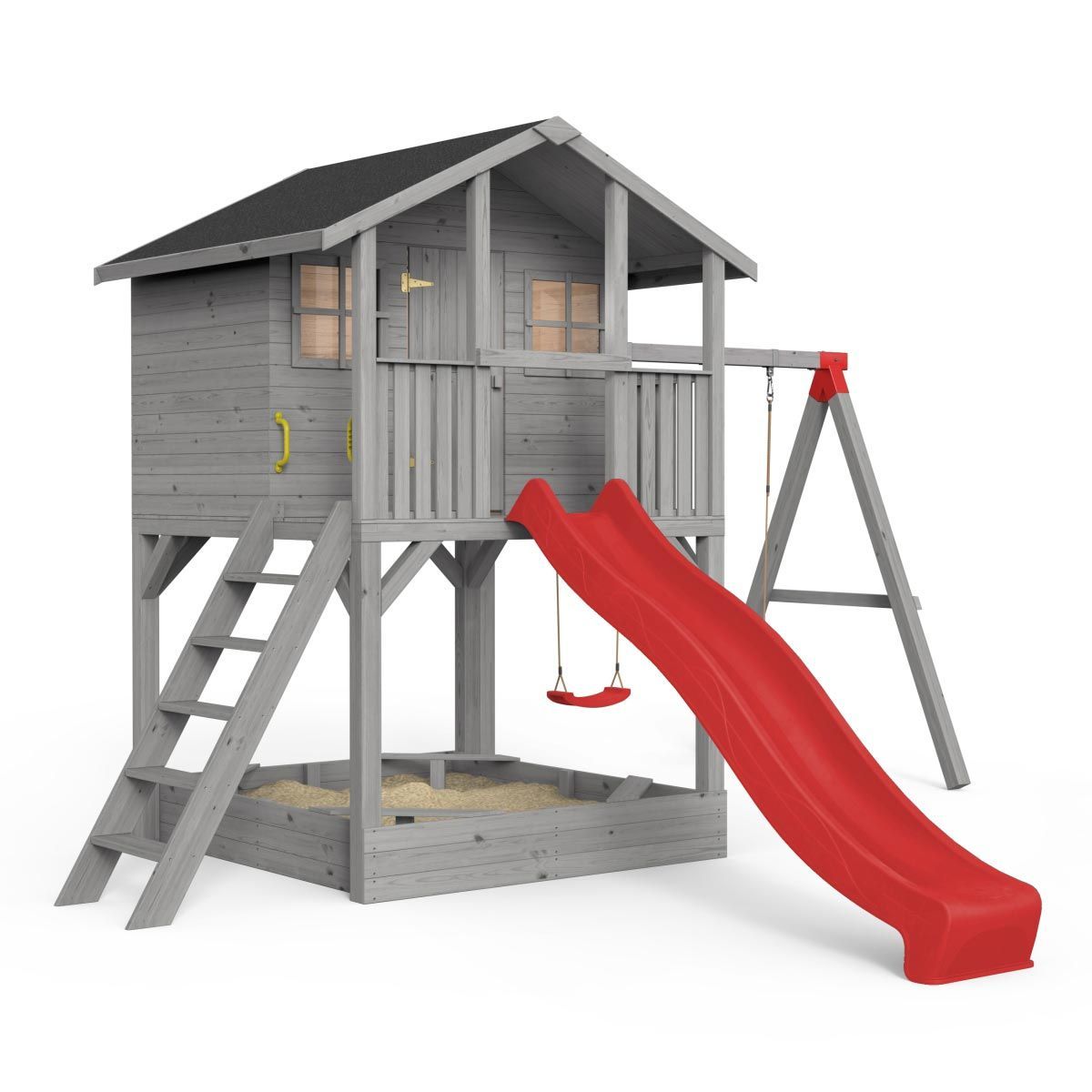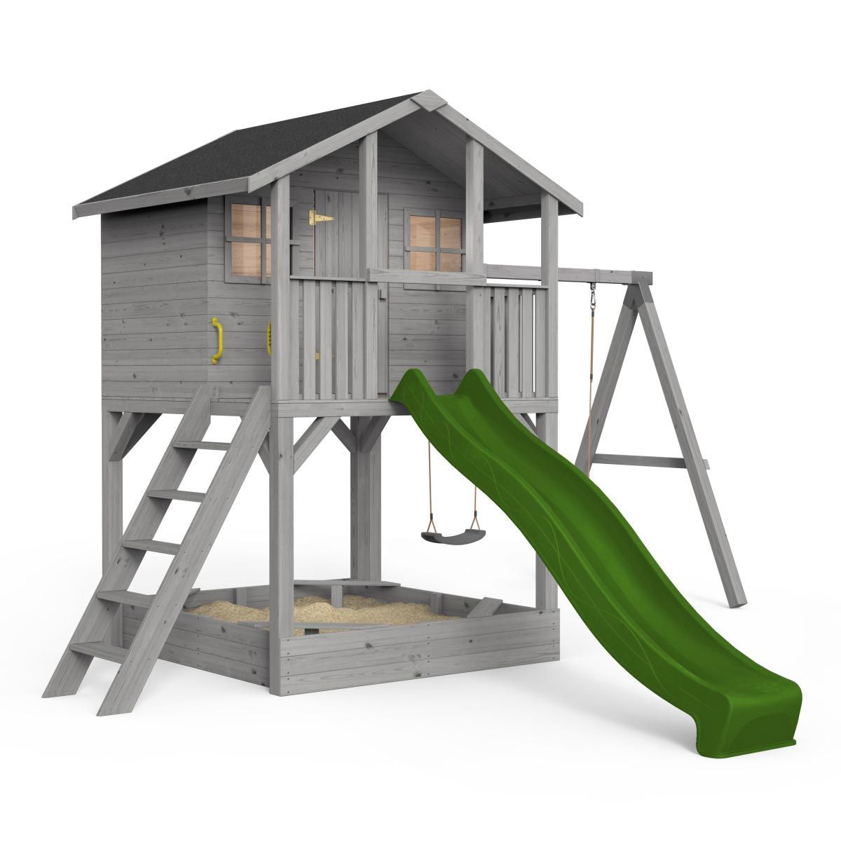 DOPPELT SCHWUNGVOLL! Ein Spielhaus mit Anbauschaukel vervielfacht die Spielmöglichkeiten für große und kleine Kinder. Sandkasten, Outdoor-Spielzimmer und Doppelschaukel. ? naturbelassenes Massivholz, nordische Fichte ? Wände 1,6 cm und Pfosten 9x9 cm ? sicherer Aufstieg auf Treppe, Veranda ? einfache Montage dank Elementbauweise ? abenteuerliche Podesthöhe, großartige Spielfläche ? Dachpappe inklusive ? Mit Rutsche und Bodenanker … weitere Vorteile siehe Produktbesc