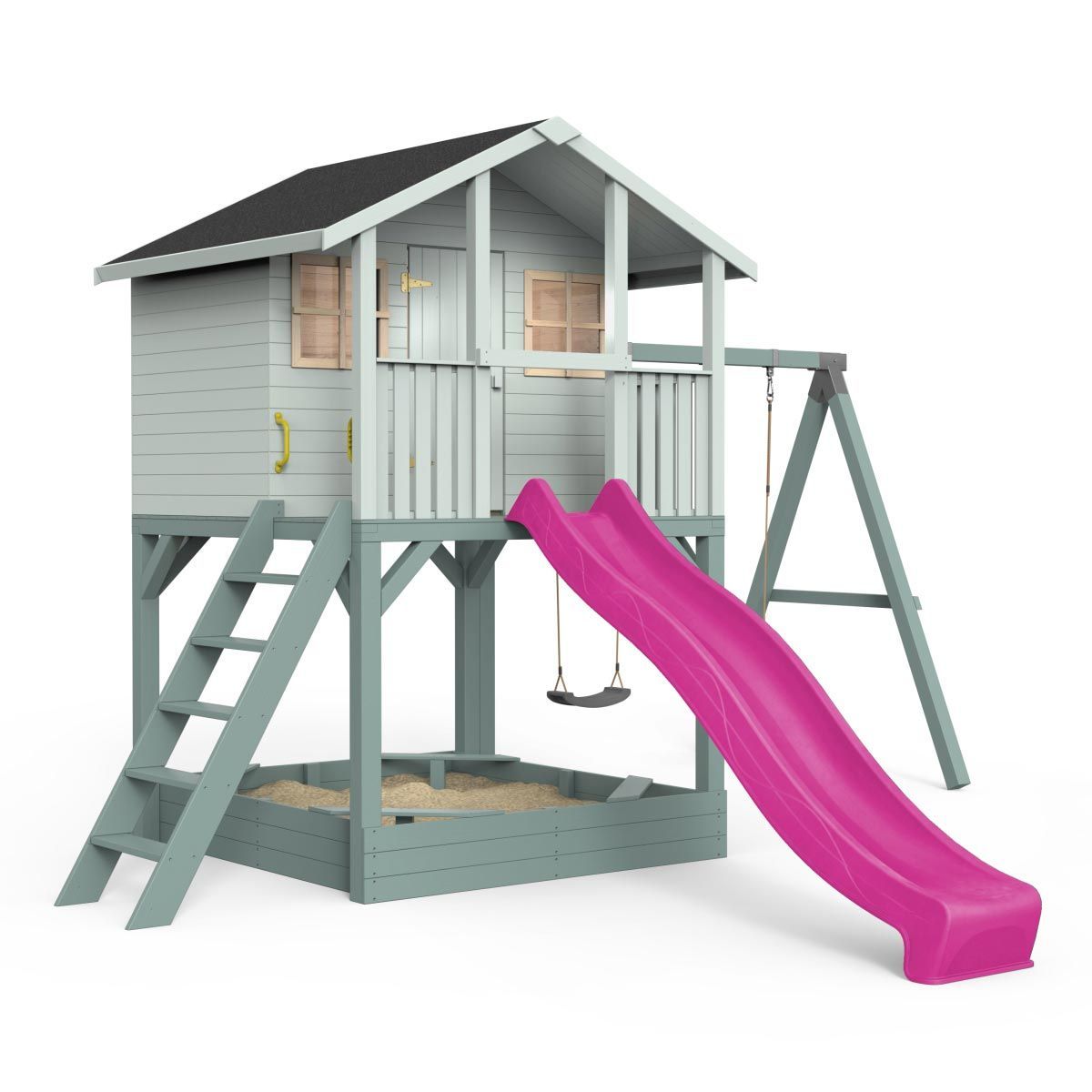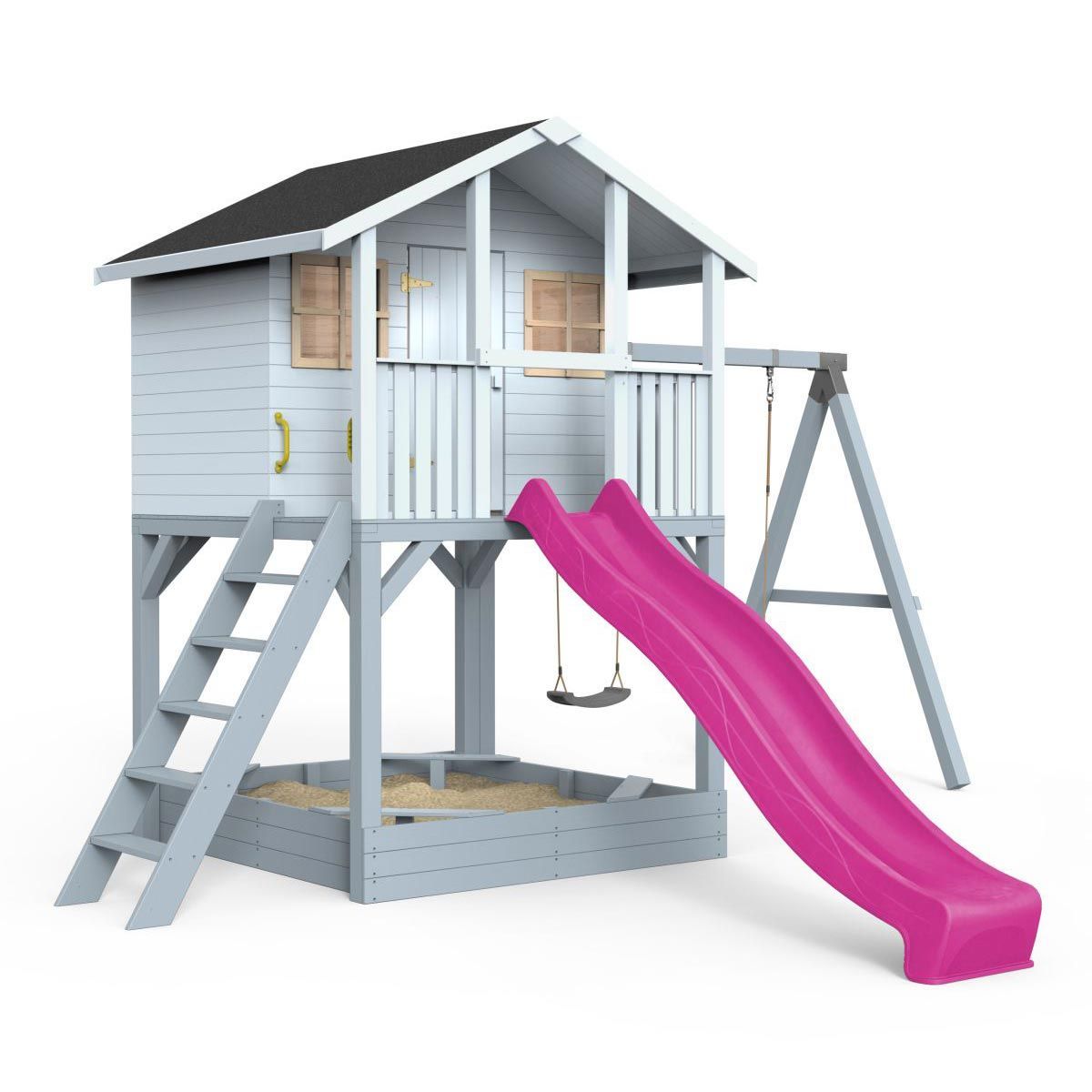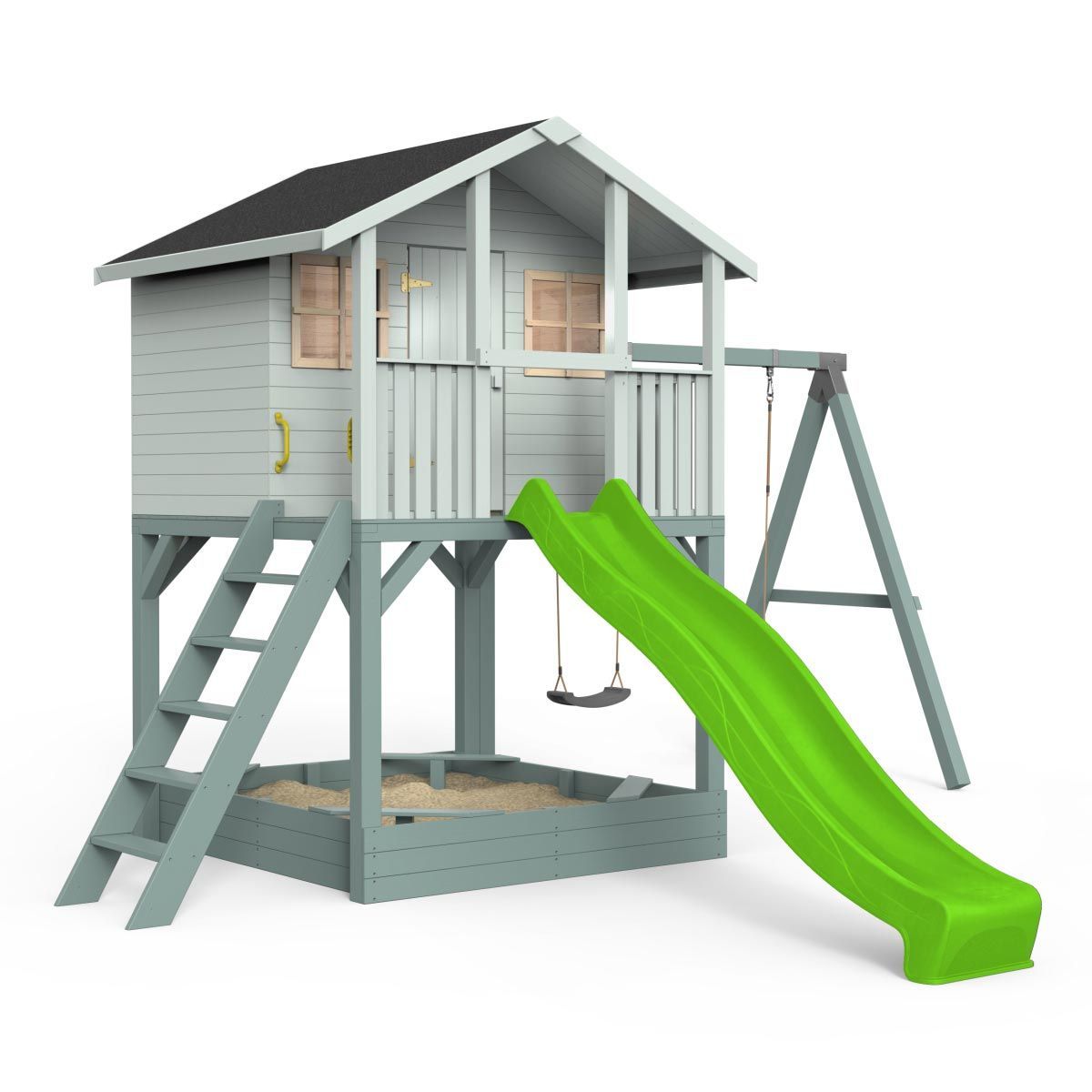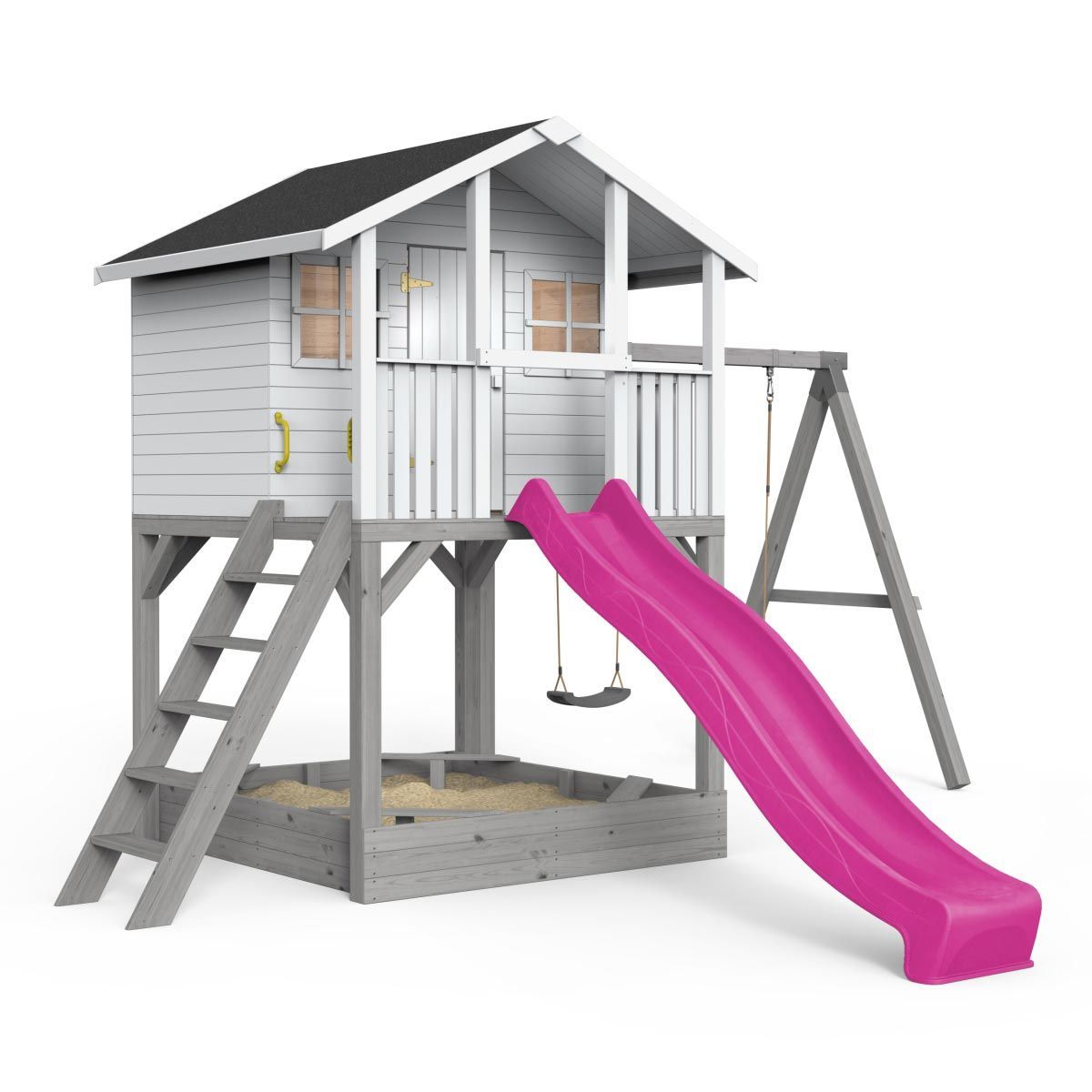 DOPPELT SCHWUNGVOLL! Ein Spielhaus mit Anbauschaukel vervielfacht die Spielmöglichkeiten für große und kleine Kinder. Sandkasten, Outdoor-Spielzimmer und Doppelschaukel. ? naturbelassenes Massivholz, nordische Fichte ? Wände 1,6 cm und Pfosten 9x9 cm ? sicherer Aufstieg auf Treppe, Veranda ? einfache Montage dank Elementbauweise ? abenteuerliche Podesthöhe, großartige Spielfläche ? Dachpappe inklusive ? Mit Rutsche und Bodenanker … weitere Vorteile siehe Produktbesc