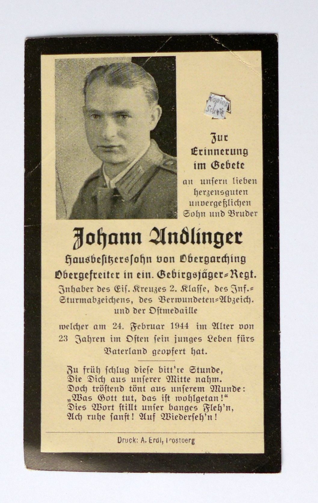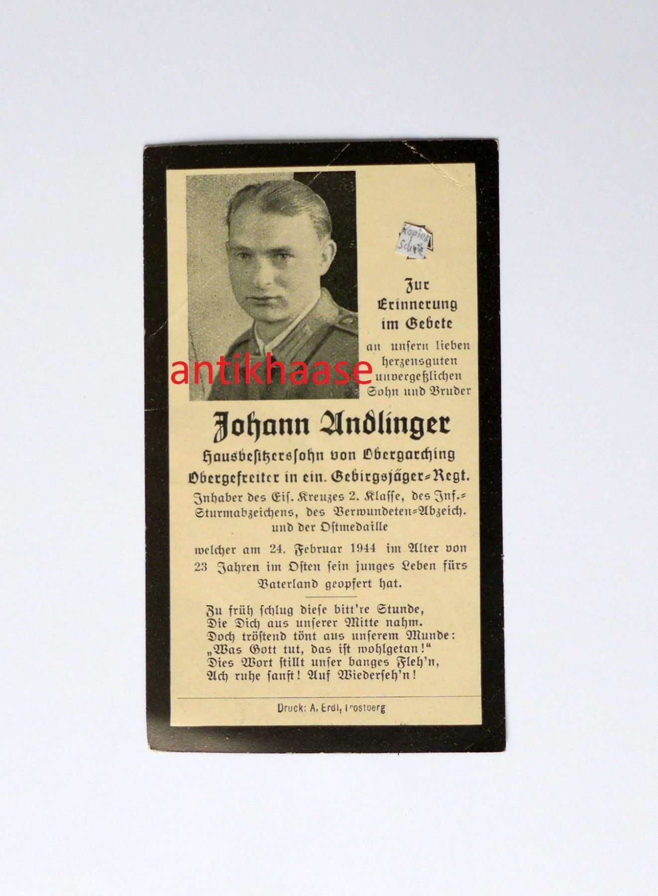 Sterbebild Gebirgsjäger Obergefreiter Auszeichnungen 1944 J. Andlinger Obergarching
