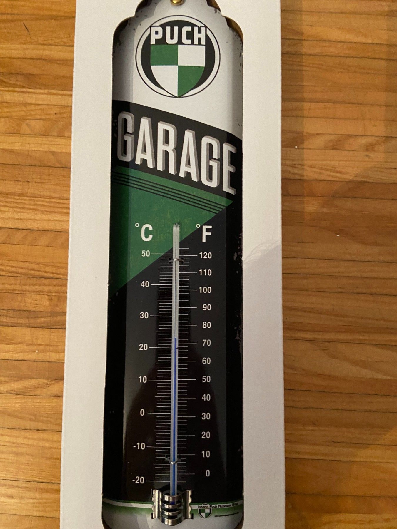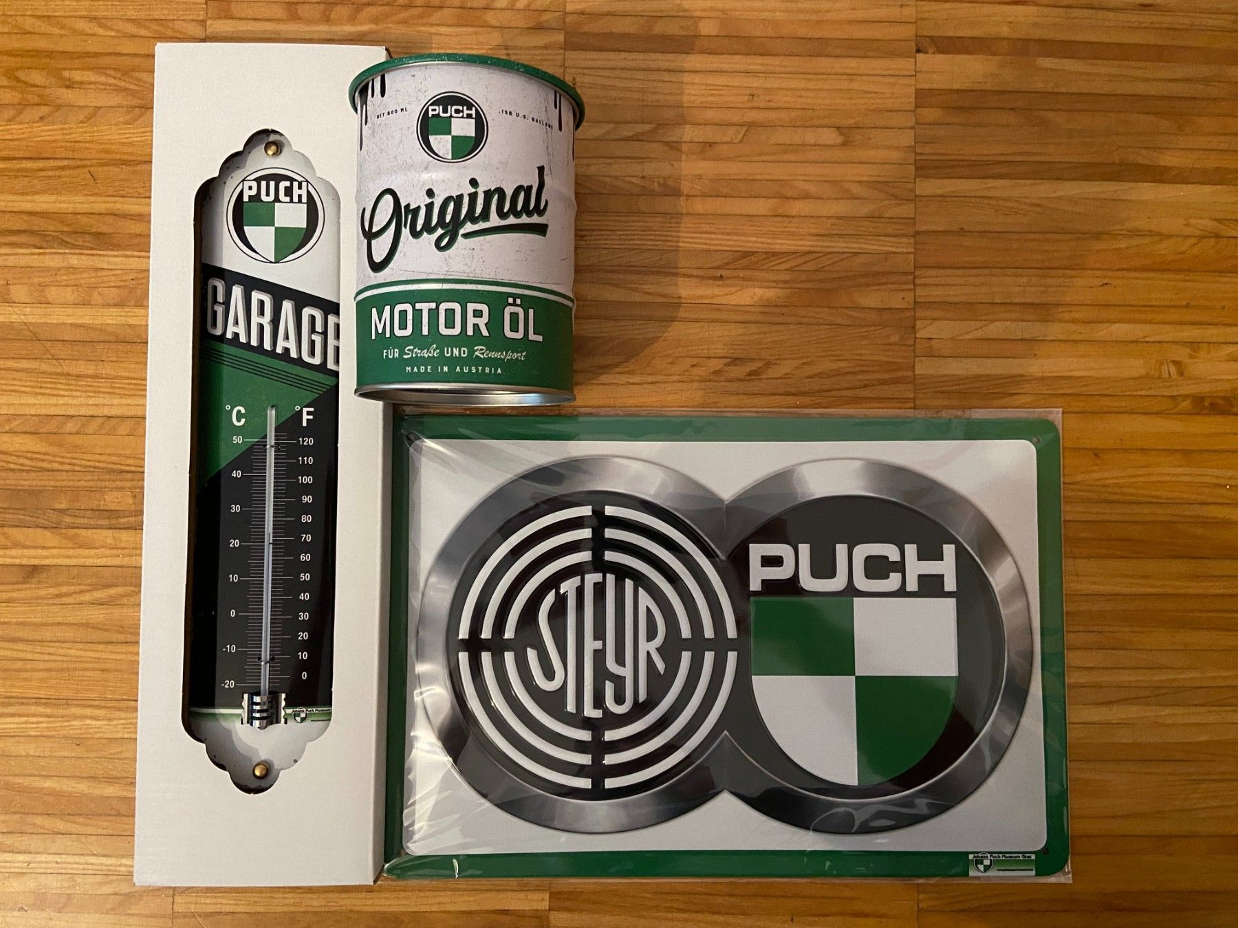 Steyr Puch Logo 3er Geschenk Set Thermometer Spardose und Blechschild 30x20cm