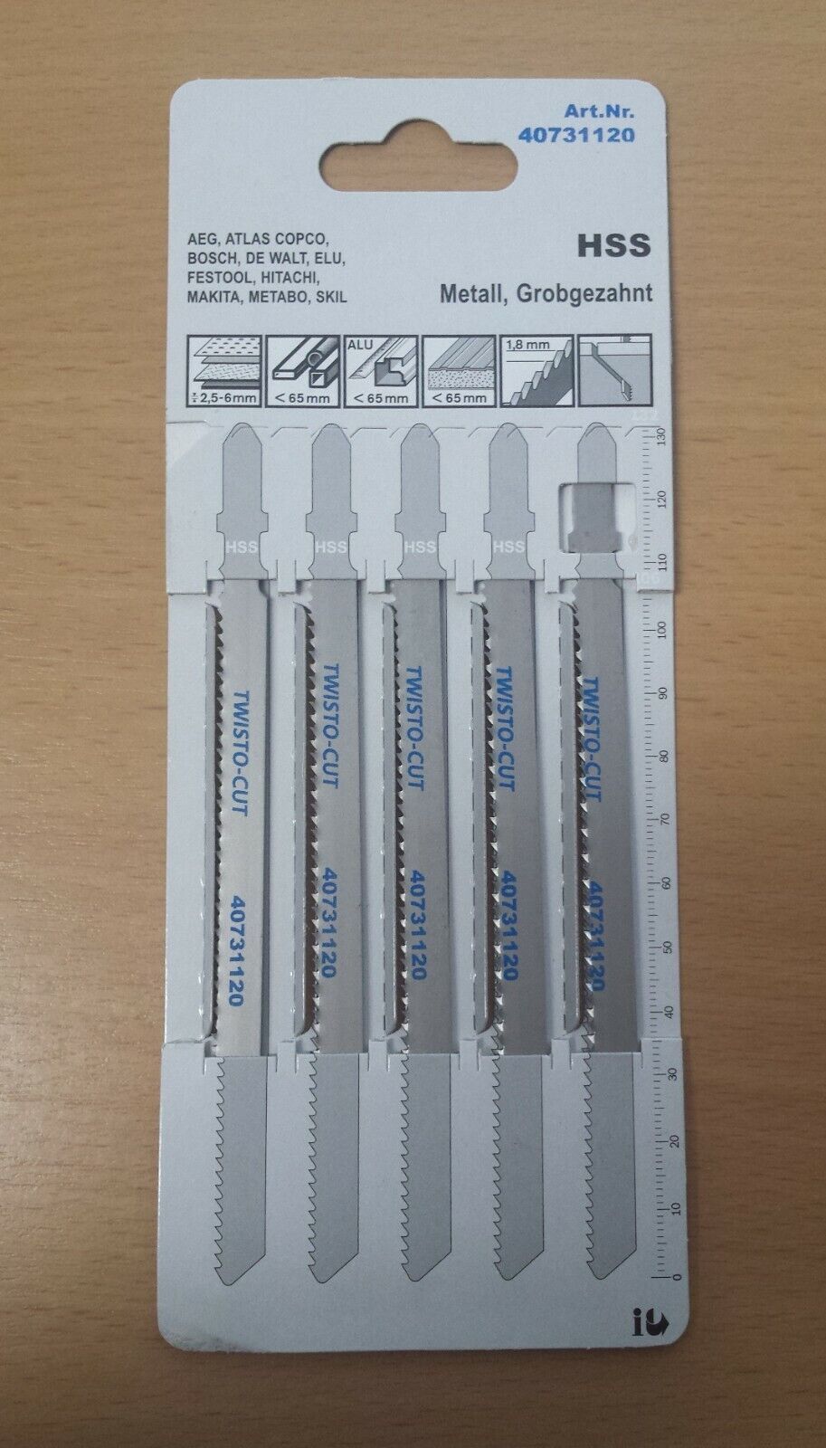 Stichsägeblatt 5 er Pack 40731120 Metall Grobgezahnt: - Schnittlänge 105 mm - TYP M 18 L - Einsatzgebiete - Stahl 2,2 - 6 mm, Profile, Rohre und Sandwichmaterialien bis 80 mm, Buntmetalle - Zahnteilung - 2,0 mm 40732340 Holz Schnellschnitt: - Schnittlänge 75 mm - TYP H 40 S - schneller Schnitt - Ein