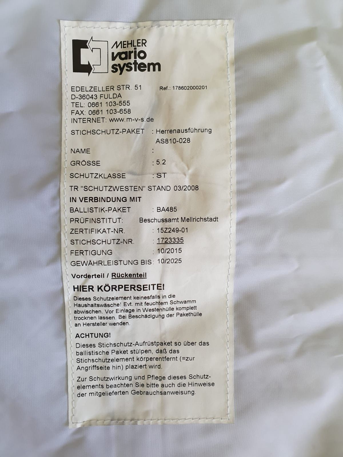 Stichschutzweste Original Mehler Kettengeflecht Polizei Security Rettungsdienst