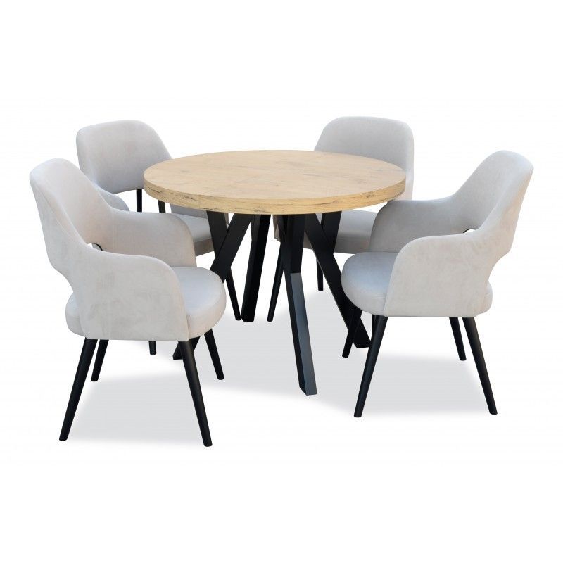 Ein elegantes Set für die Küche oder das Esszimmer, bestehend aus einem runden Klapptisch und stilvollen, gepolsterten Stühlen mit bequemen Rückenlehnen.