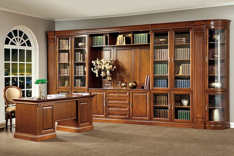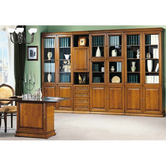 Stilvoller Brauner Büroschrank Massivholz Glastüren Arbeitszimmer Regale