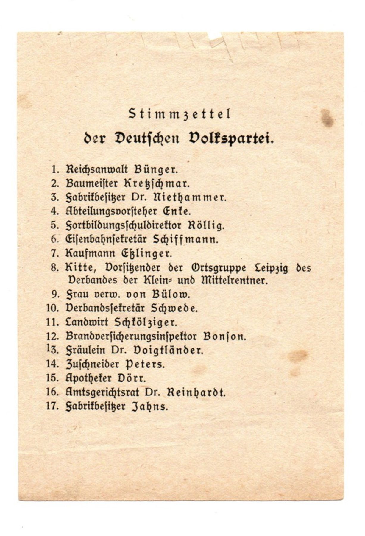 Stimmzettel der Deutschen Volkspartei Leipzig von 1919 Höhe 12,7cm Breite 9,0cm Zustand Gut sehe Bilder, Auf der Linke Seite leicht aufgerissenca 1cm