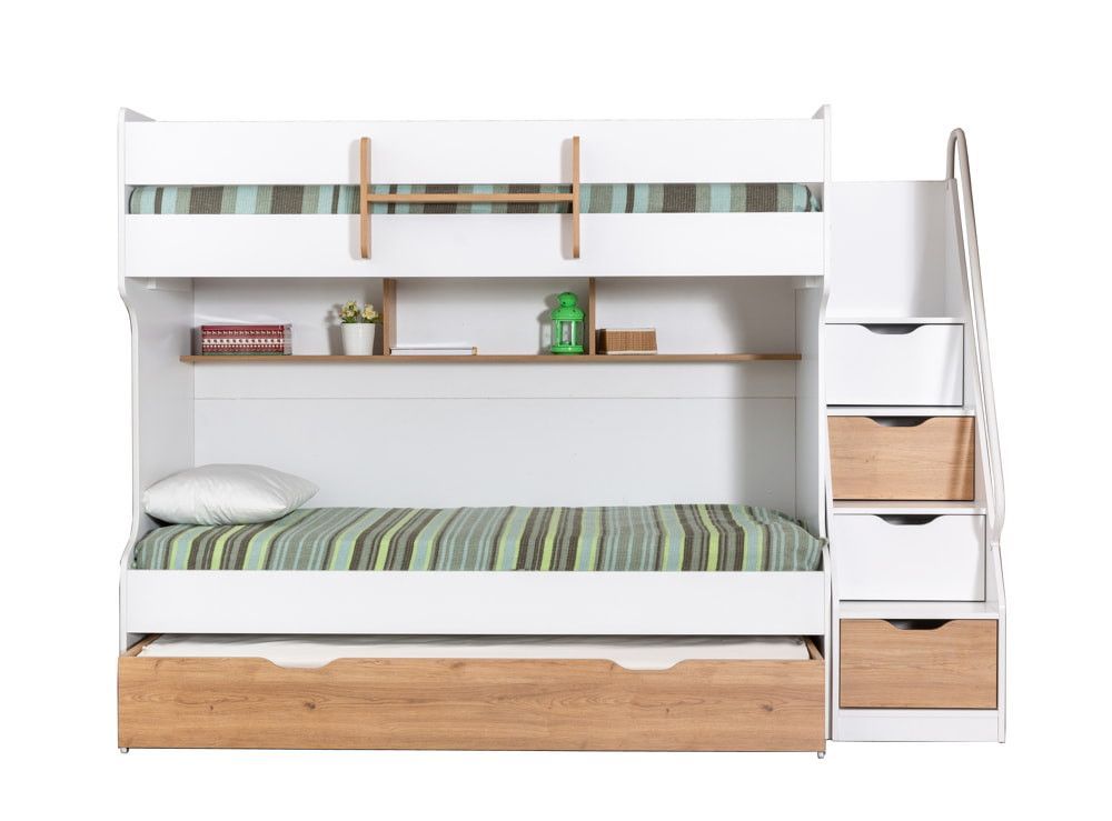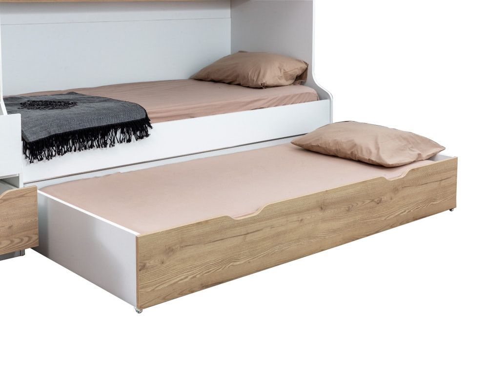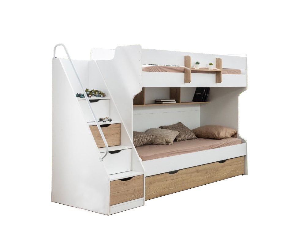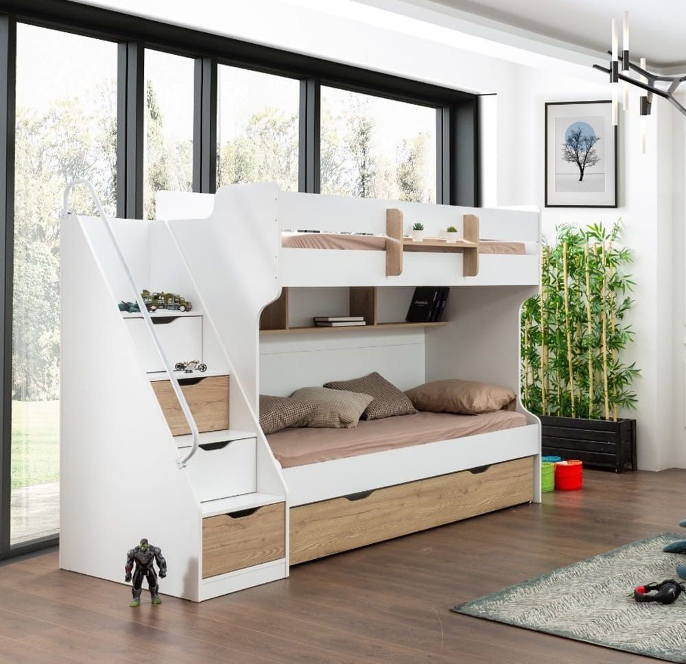 byMM Stockbett Etagenbett SONOMO Compact 90x200cm weiß mit Gästebett , Regal und Geländer