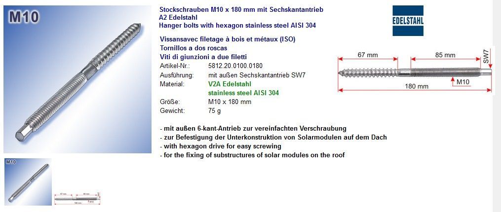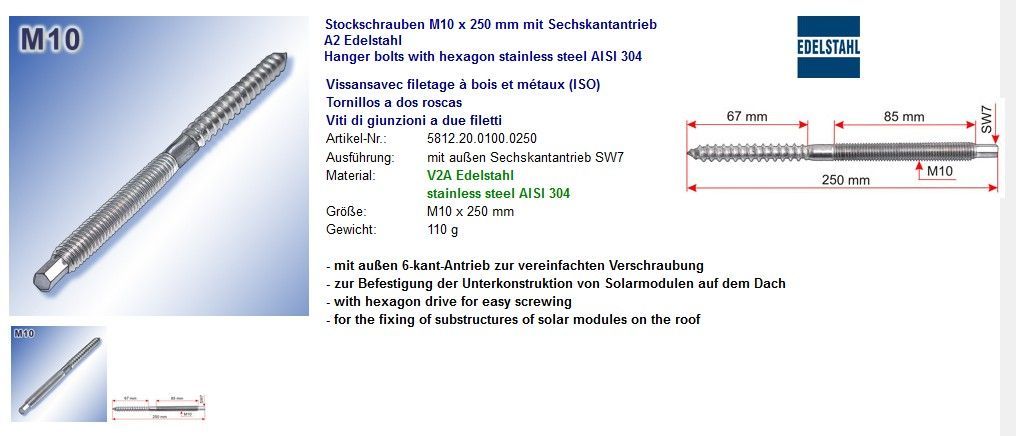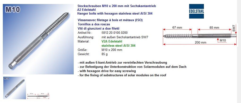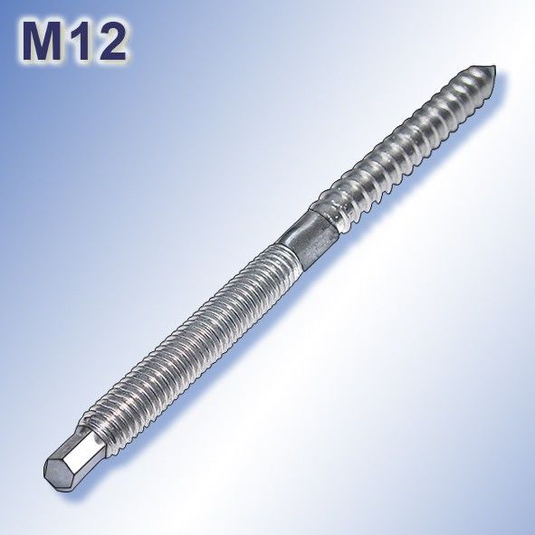 Stockschrauben M12 x 200 mm mit Sechskantantrieb A2 Edelstahl Hanger bolts with hexagon stainless steel AISI 304 Vissansavec filetage à bois et métaux (ISO) Tornillos a dos roscas Viti di giunzioni a due filetti Ausführung: mit außen Sechskantantrieb SW9 Material: V2A Edelstahl stainle