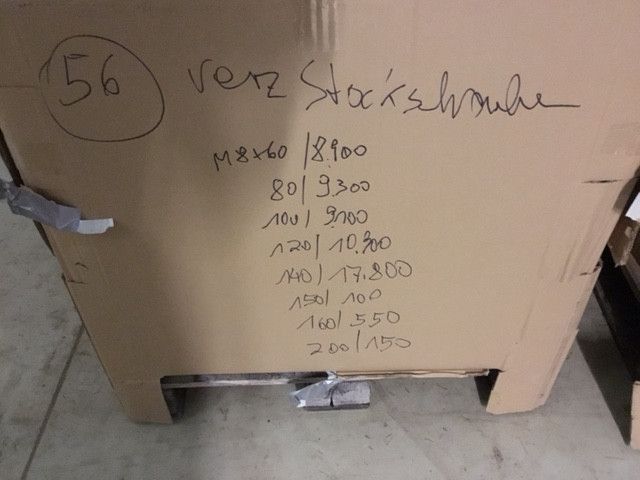 Abverkauf Stockschrauben verzinkt Holzgewinde oder metrisches Gewinde Abmessungen: M8 x 60 Menge 8.900 Stück M8 x 80 Menge 9.300 Stück M8 x 100 Menge 9.100 Stück M8 x 120 Menge 10.300 Stück M8 x 140 Menge 17.800 Stück M8 x 150 Menge 100 Stück M8 x 160 Menge 550 Stück M8 x 200 Menge 150 Stück Gesamtm