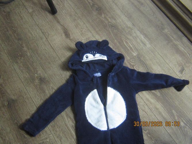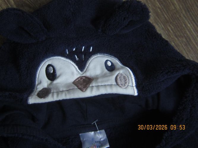 Ein kleiner dunkelblauer Fleec-Anzug mit Kapuze und Reißverschluss . Die Länge ist gemessen 61 cm