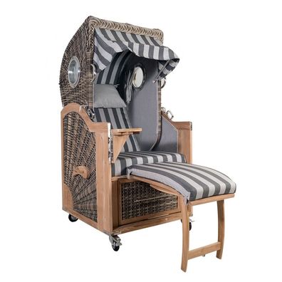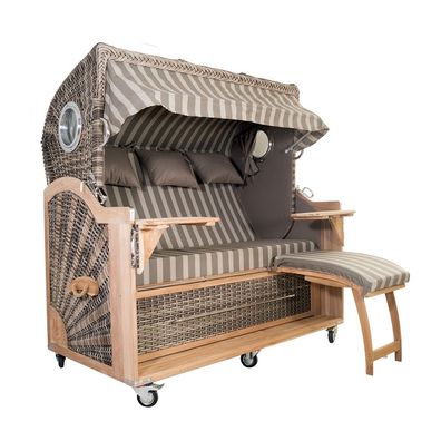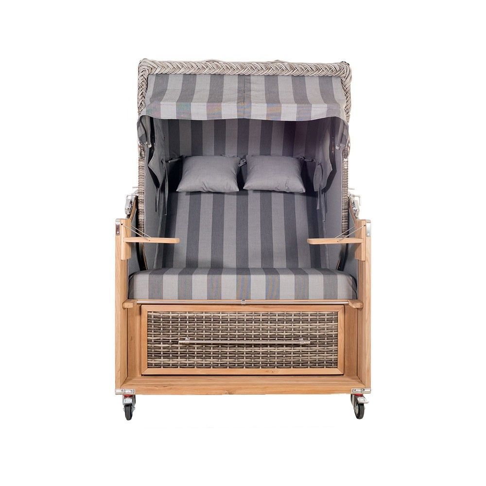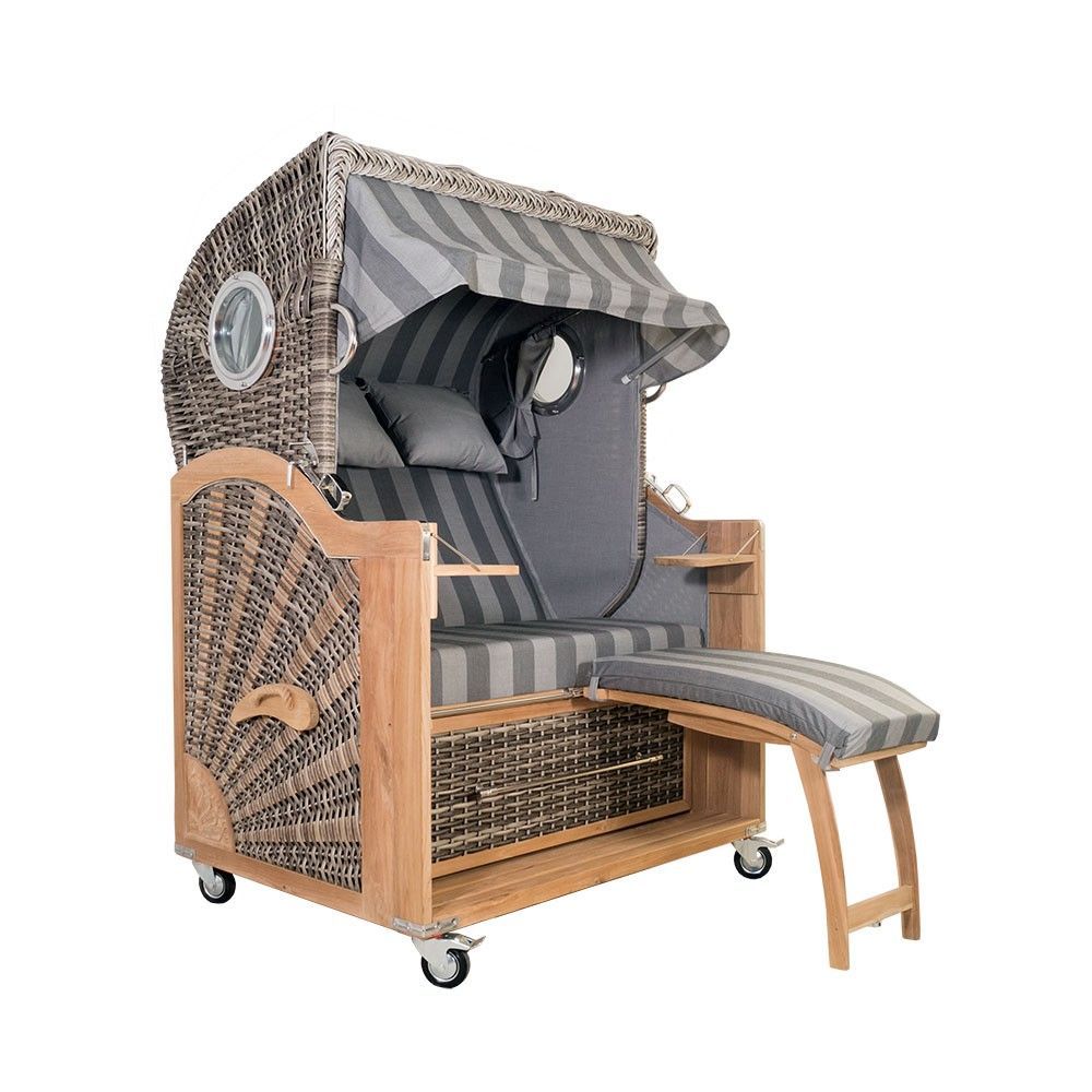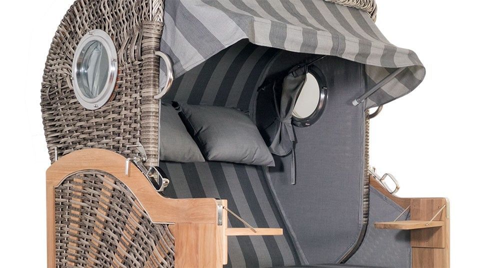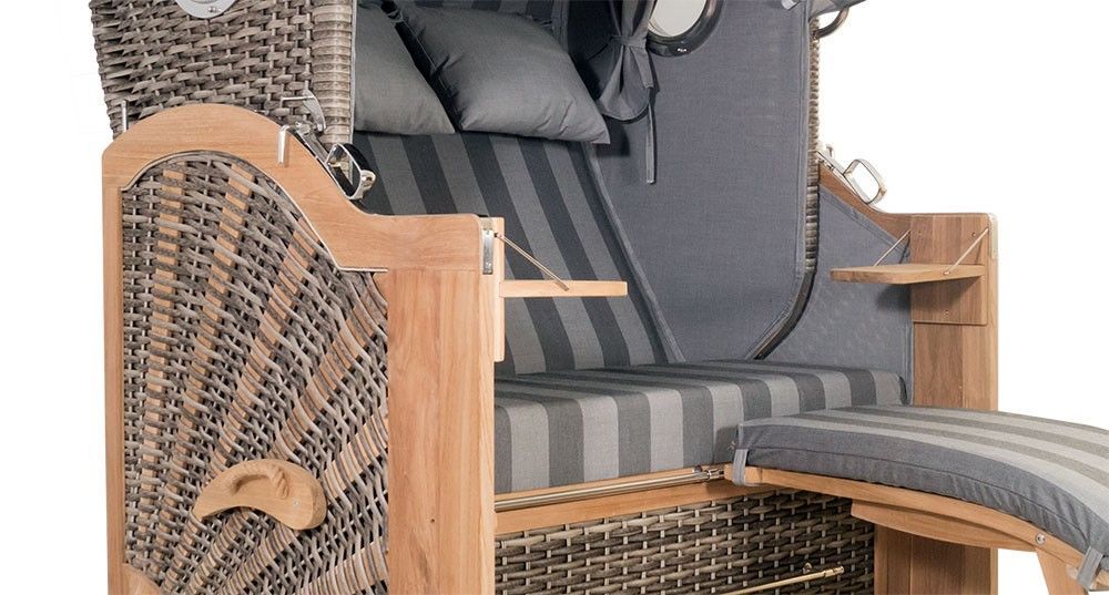 • Strandkorb Kampen Spezial 2,5-Sitzer Banana grau gestreift Polyrattan Teakholz