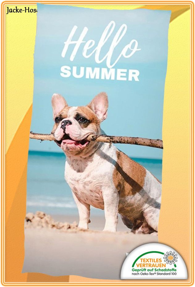 Strandtuch Hund Badetuch Saunatuch Strandlaken HELLO SUMMER Bulldogge Gr:70x140cm NEU