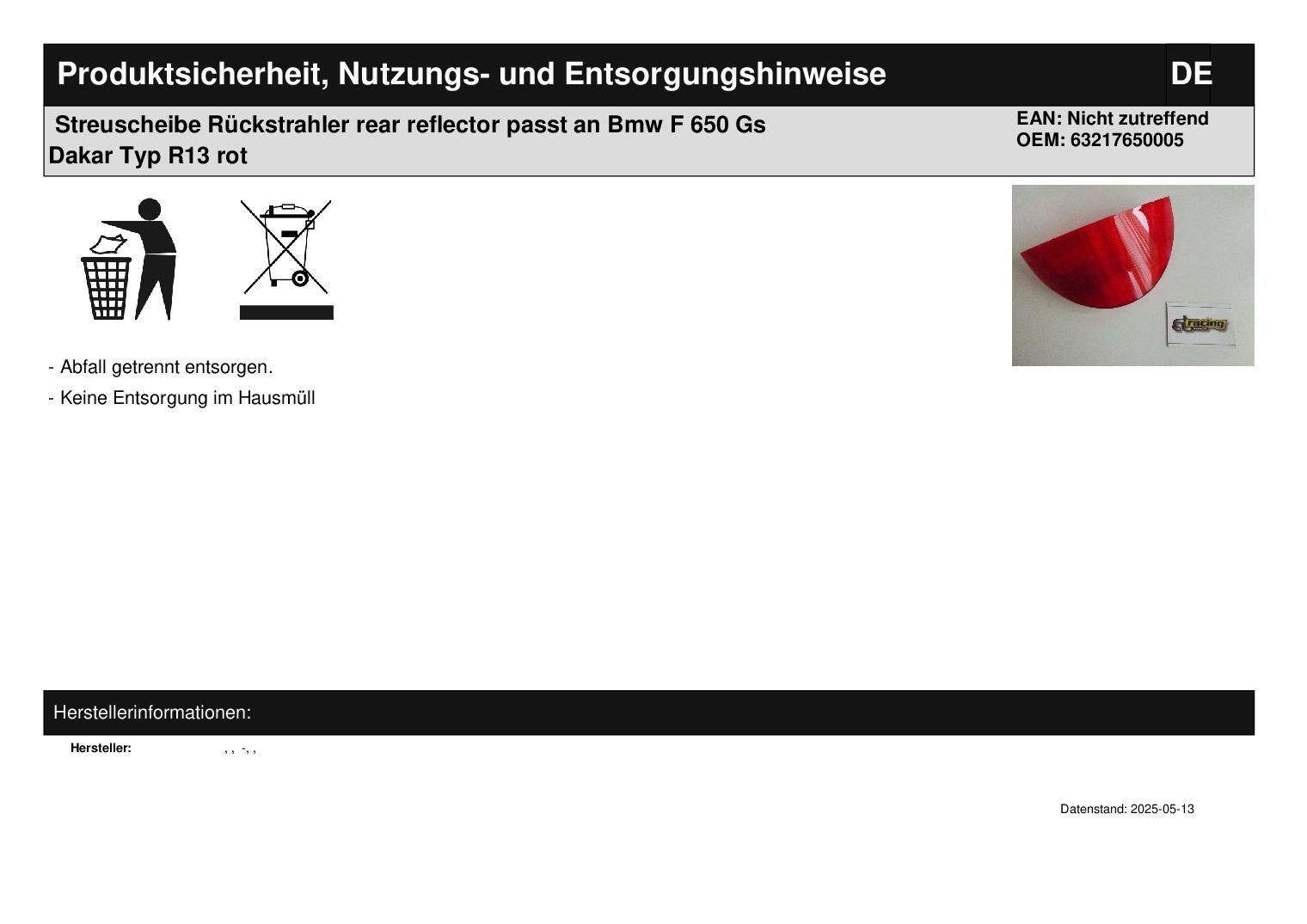 Streuscheibe Rückstrahler rear reflector passt an Bmw F 650 Gs Dakar Typ R13 rot