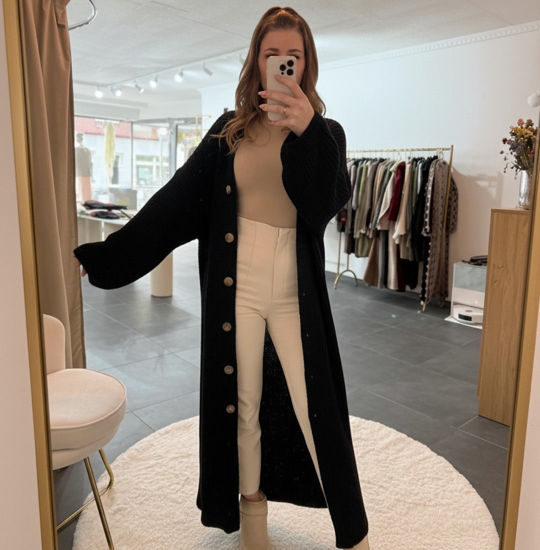 Strickjacke Long Damen Lena Schwarz Onesize XS-XL Frauen Langer Strick Jacke
