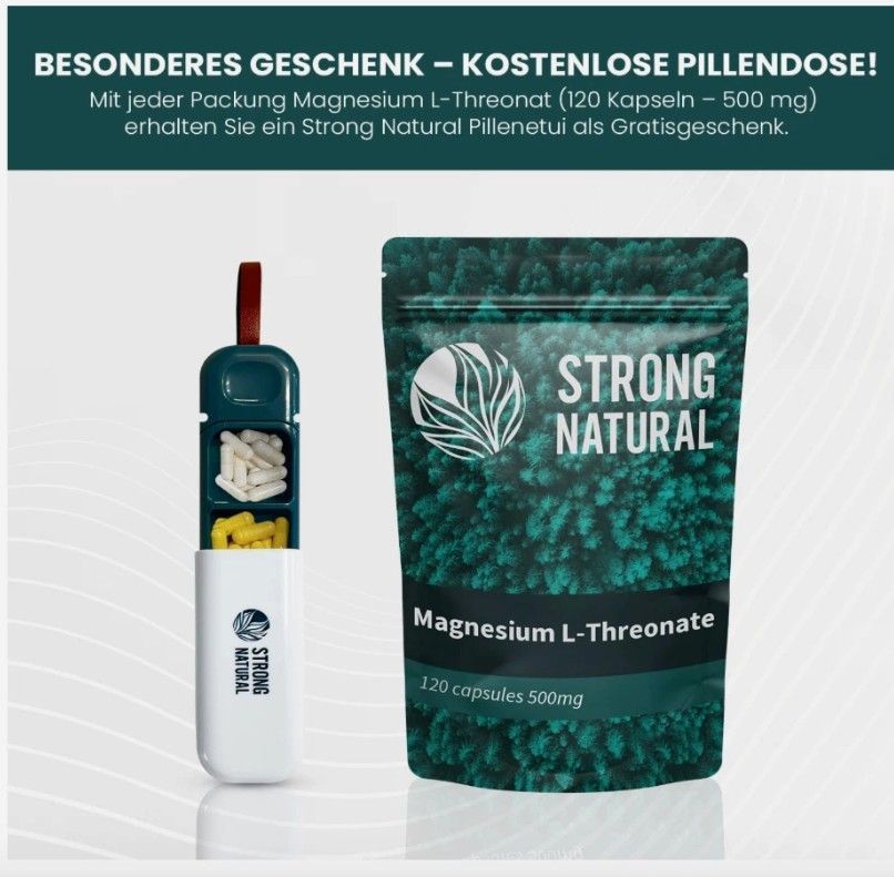 Strong Natural - Magnesium L-Threonat 120 Kapseln - Kostenlose Pillendose - 2000 mg Tagesdosis - 100% Natürlich, Laborgeprüft, Optimale Bioverfügbarkeit, Unterstützt Gedächtnis