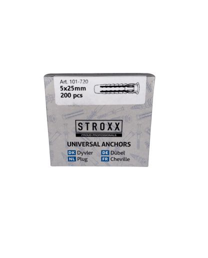 Stroxx Dübel 5x25 6x30 6x50 8x40 10x50 12x60 Universaldübel Allzweckdübel Die STROXX Universaldübel sind vielseitig einsetzbare Dübel, die sich für eine breite Palette von Anwendungen eignen. Sie sind in verschiedenen Größen erhältlich und können in verschiedenen Baustoffen wie Beton, Mauerwerk, Gip