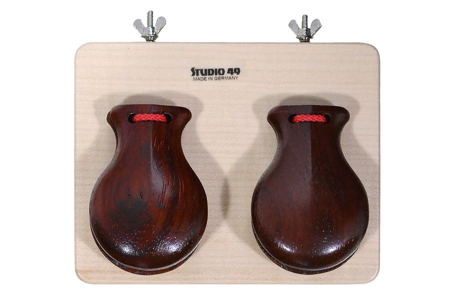Studio 49 Kastagnettenmaschine RCA 2 Studio 49 hat zwei Orchesterkastagnetten aus Rosenholz auf einem massiven Holzblock montiert, sodass das Instrument mit den Fingern, bzw. mit den Händen gespielt, aber auch mit Drum-Sticks oder anderem Schlagwerk zum Klingen gebracht werden kann. Die Features der