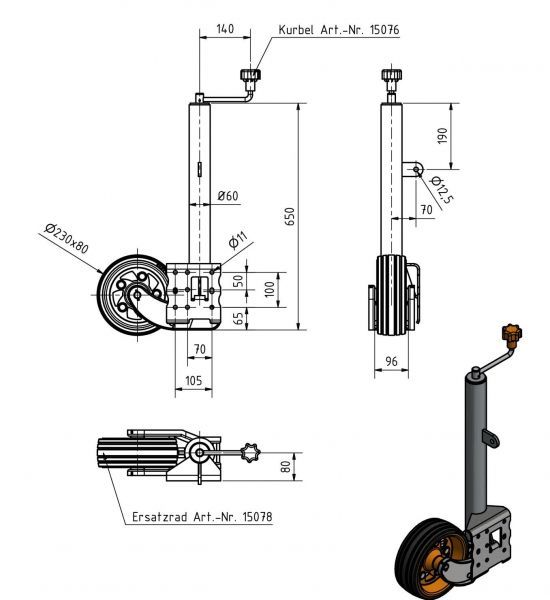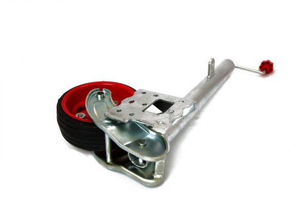 Stützrad, Ø 60 mm, 230 x 80 mm Vollgummi auf Stahlfelge, vollautomatisch klappbar Stützrad, Ø 60 mm, 230 x 80 mm Vollgummi auf Stahlfelge, vollautomatisch klappbar Stützräder gehören zu den Stützeinrichtungen an Zentralachsanhängern, welche die STVZO vorschreibt, wenn die Stützlast meh