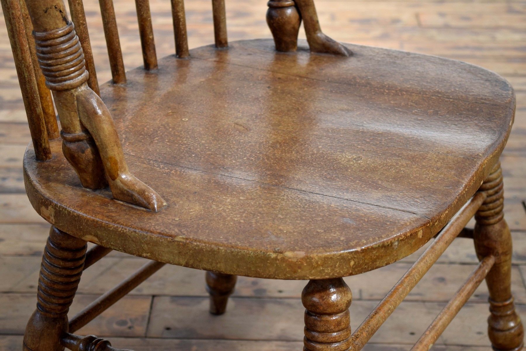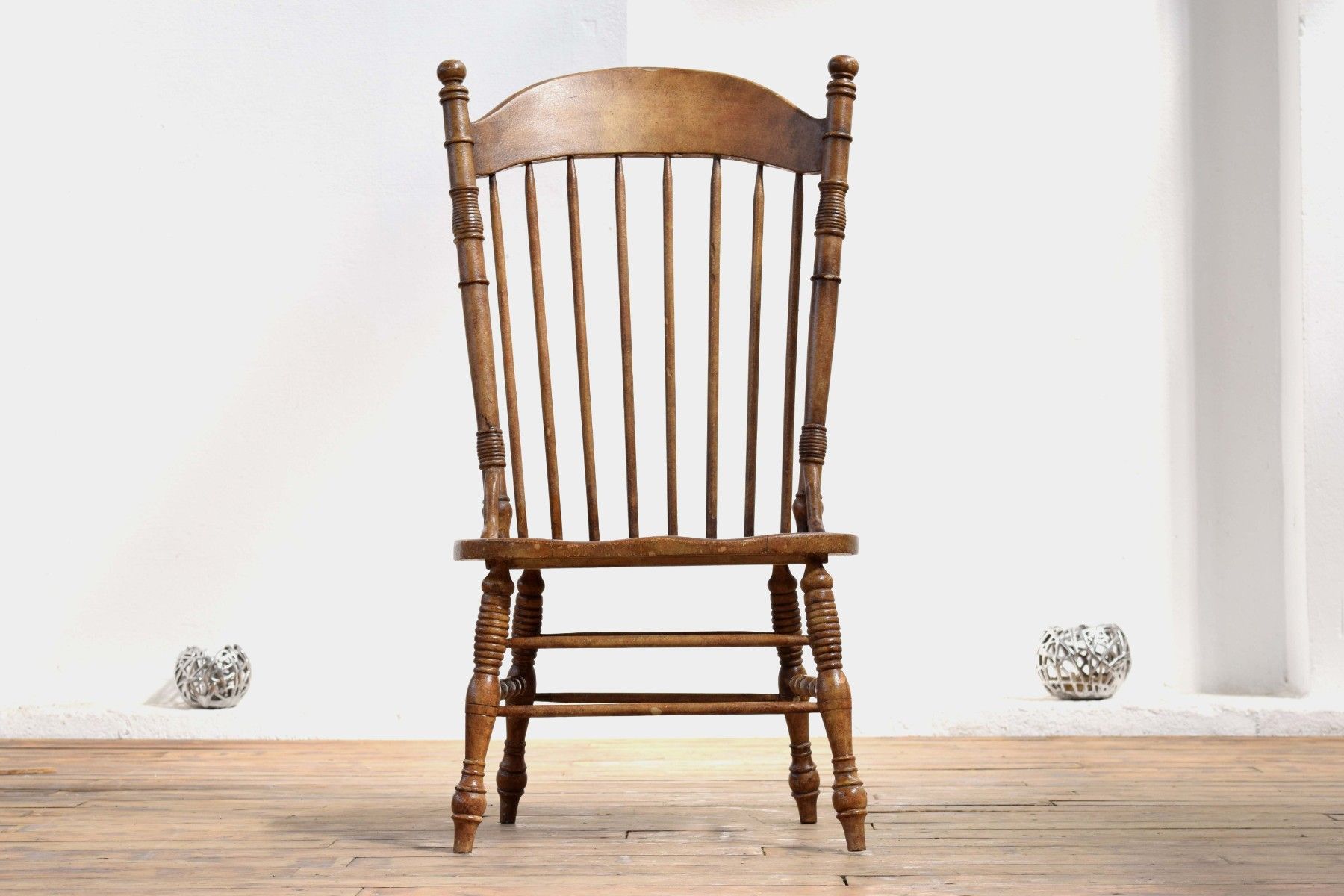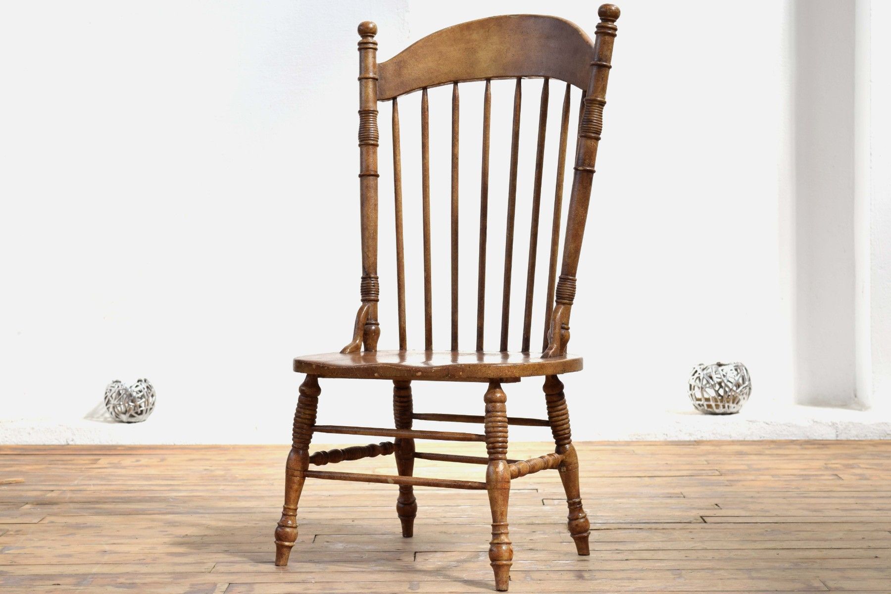 charakterstarker, historischer Stuhl aus kunstvoll gedrechseltem Vollholz, brauner Farbauftrag gebraucht,insgesamt gepflegt, stabil und langfristig nutzbar ergonomisch geformte Sitzfläche, guter Sitzkomfort Sitzhöhe 45cm, Lehnenhöhe 115cm, Breite 64cm, Tiefe 57cm