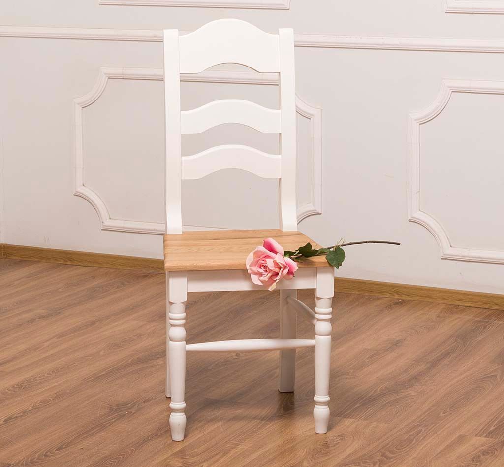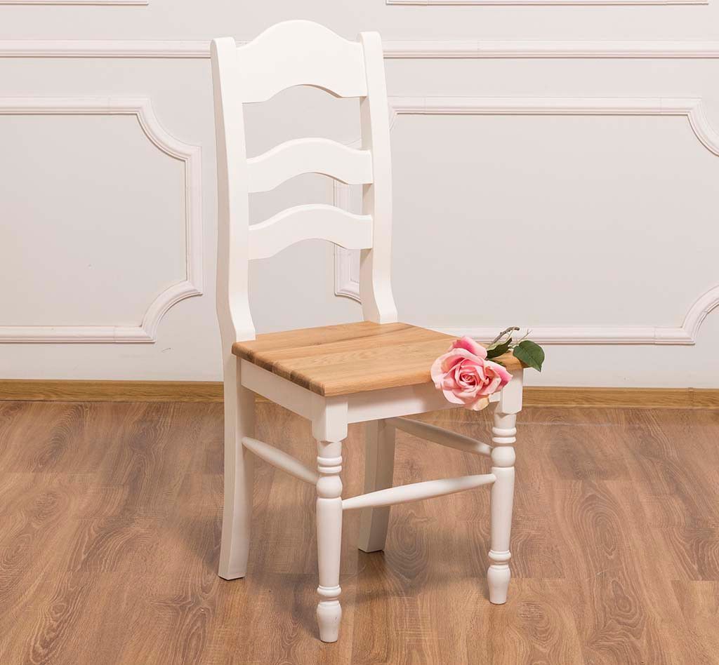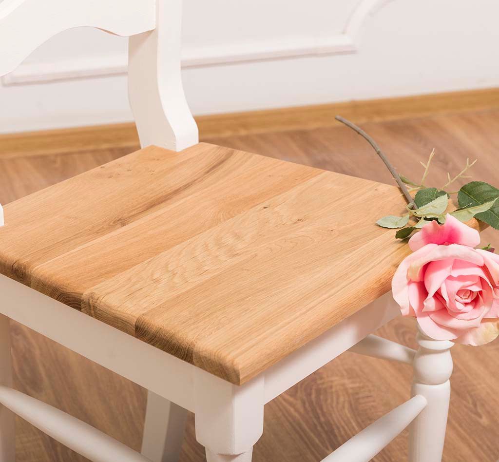 Romantischer Landhausstuhl 100 % Massivholz Korpus: P039-RAL9010 altweiß lackiert Sitzfläche: Eichenplatte P061 acryl natur lackiert Maße: L: 44 cm, B: 44 cm, H: 102 cm Sitzhöhe: ca. 45 cm