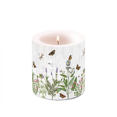 • Stumpenkerze Paraffin 7,5x9cm mit Sommerwiese Motiv Weiß / Grün