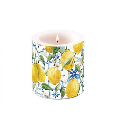 • Stumpenkerze Paraffin 7,5x9cm mit Zitronen Muster Gelb / Weiß