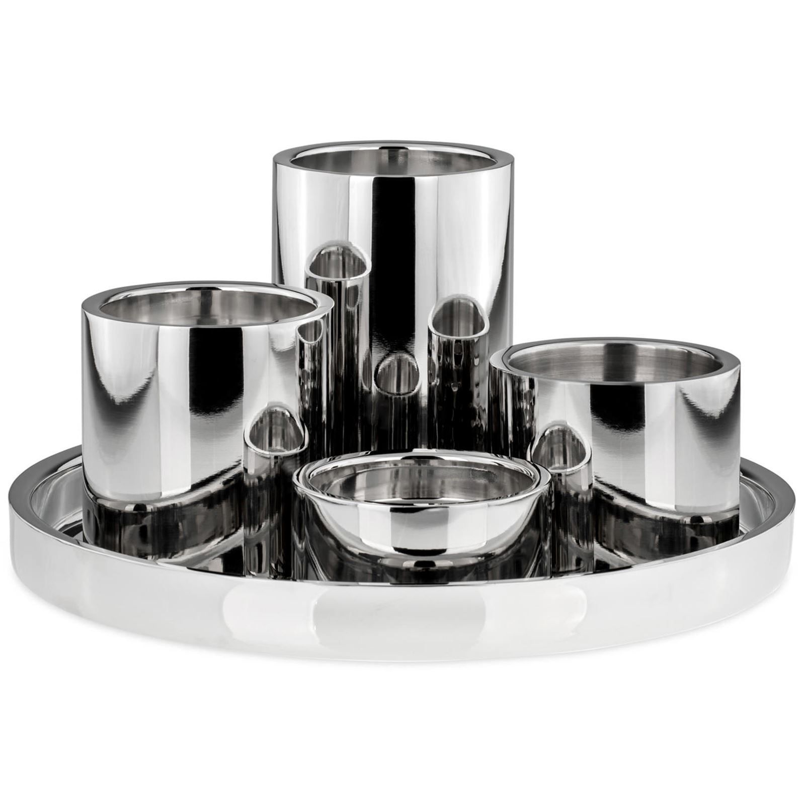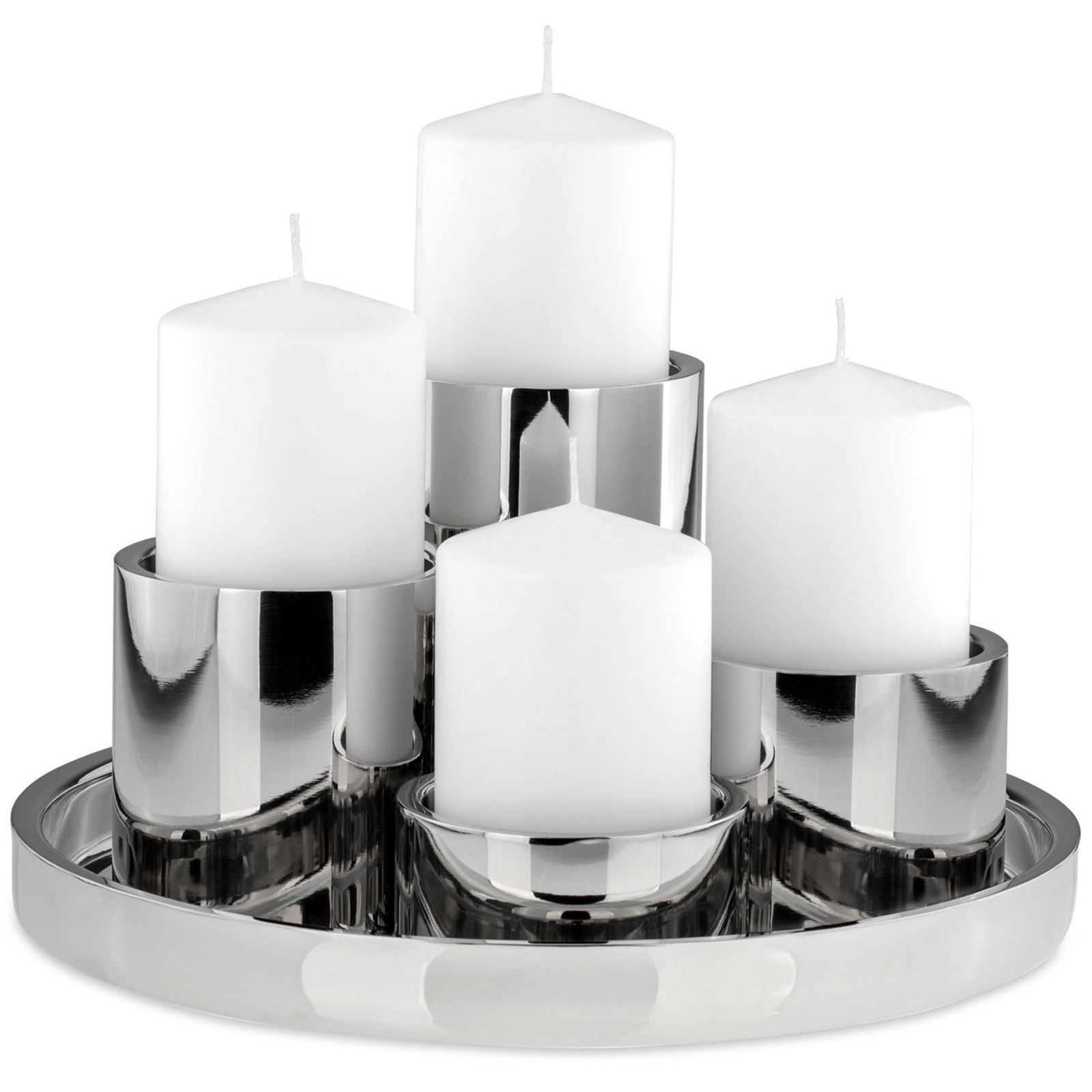 Stumpenkerzen-Halter Set 5tlg Edelstahl Silber Kerzenständer auf Tablett Ø 32 cm