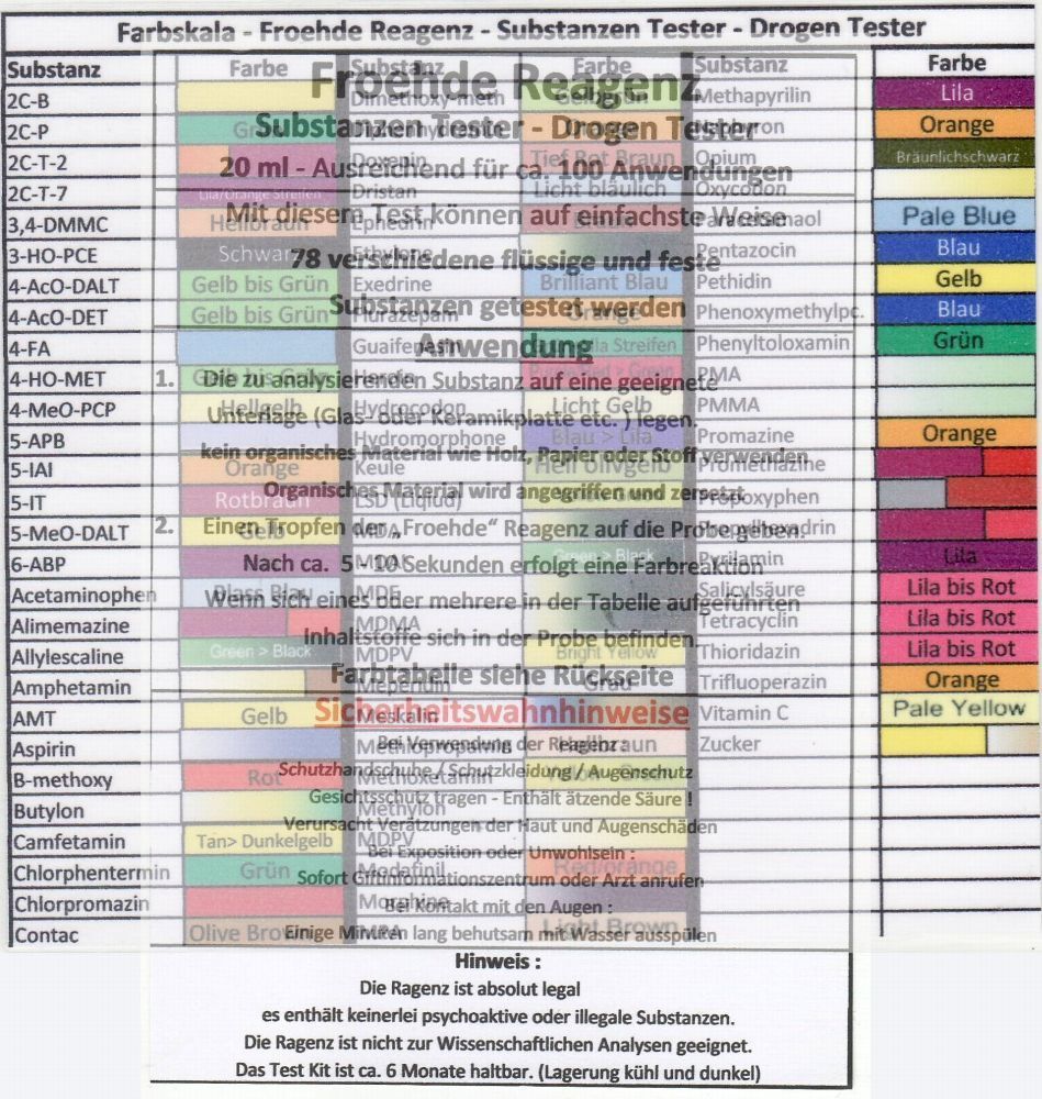 Substanzen Tester - Fröhde Reagenz 20 ml mit Farbskala - Testet 72 Substanzen