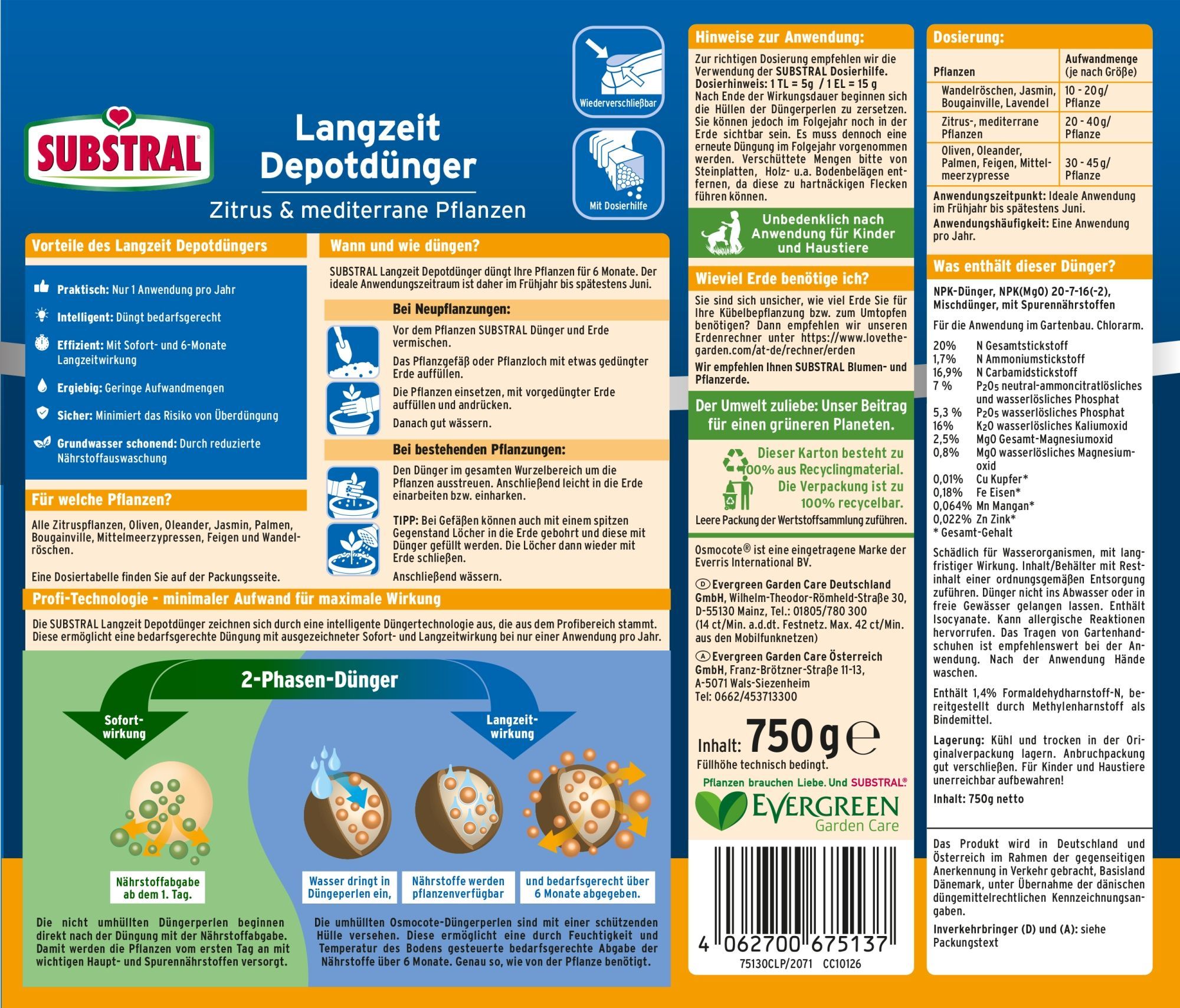 SUBSTRAL® Langzeit Depotdünger für Zitrus & Mediterrane Pflanzen, 750 g